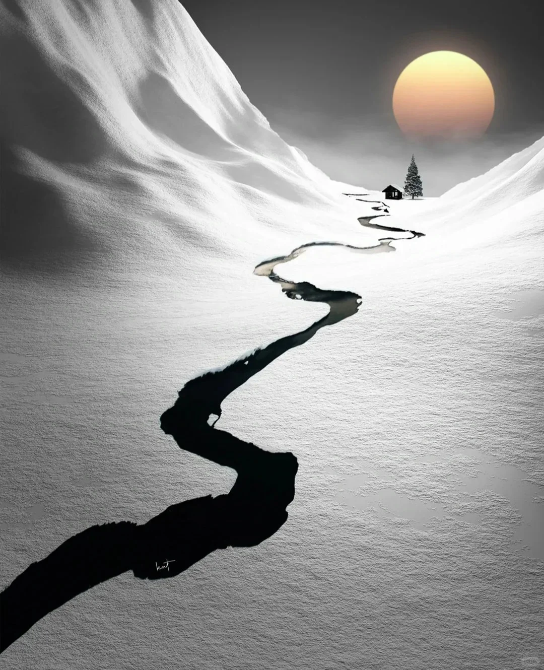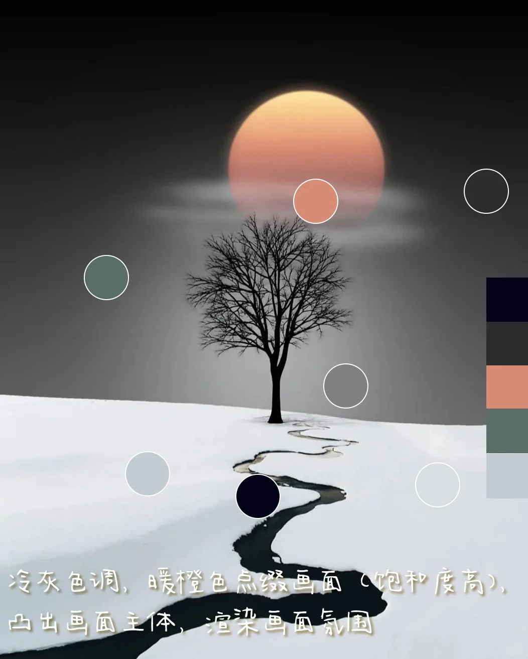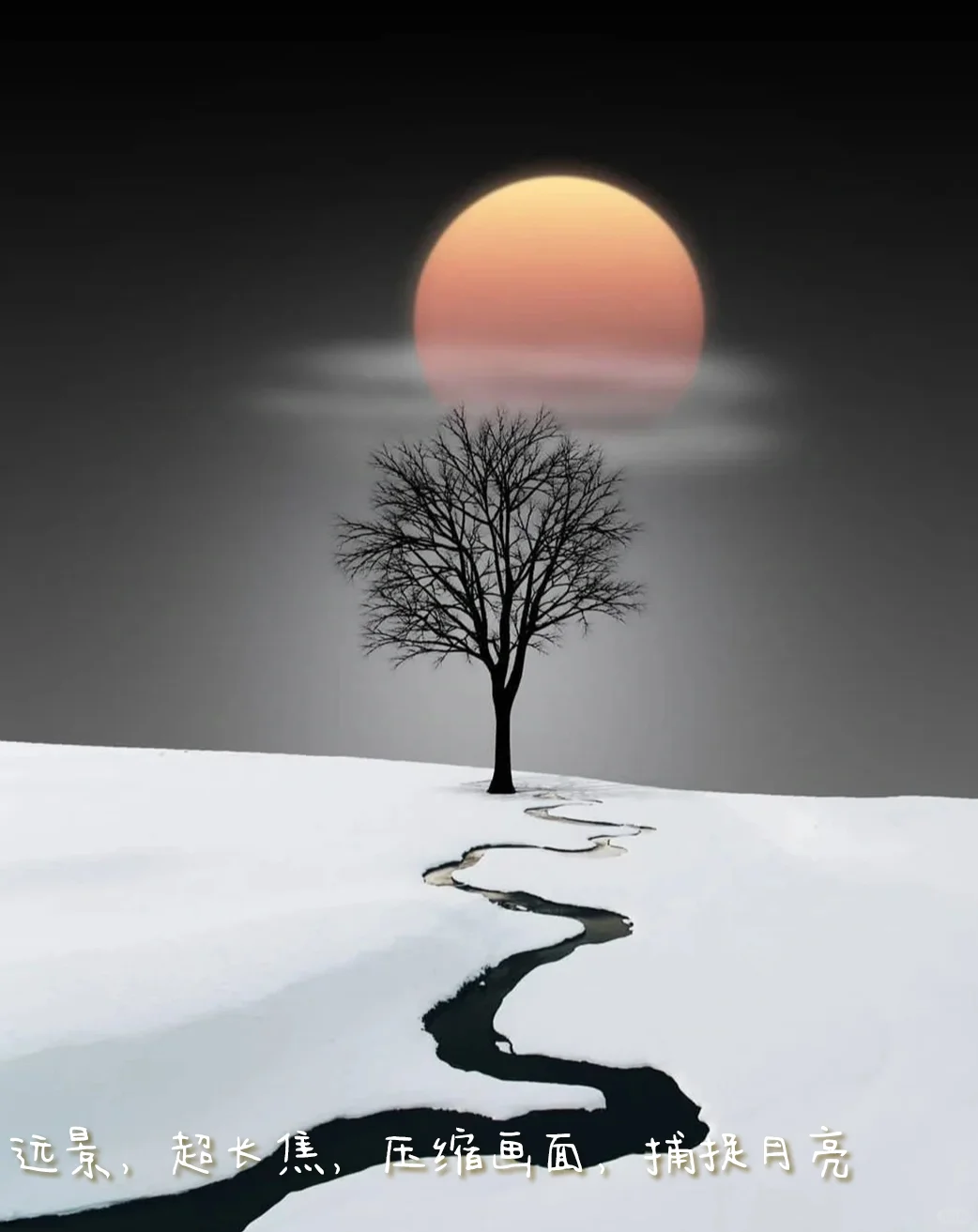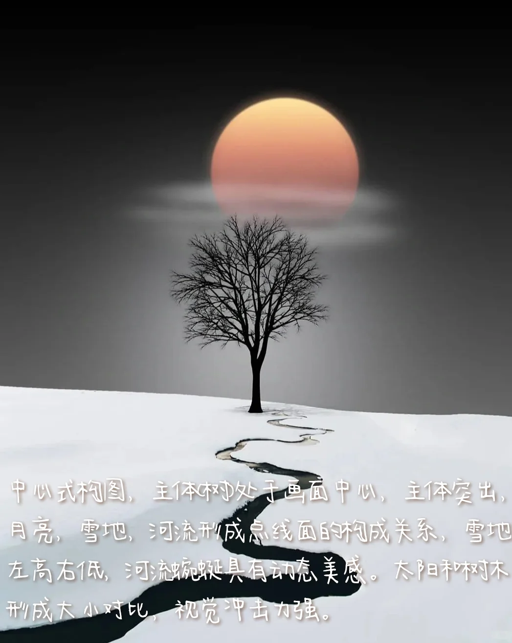 1.构图:中心式构图,主体(树)处于画面中心,主体突出,月亮,雪地,河流形成点线面的构成关系,雪地左高右低,河流蜿蜒具有动态美感。太阳和树木形成大小对比,视觉冲击力强。