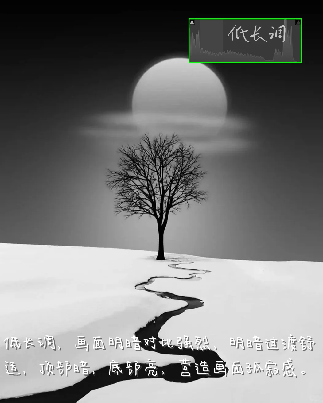 3.影调:低长调,画面明暗对比强烈,明暗过渡舒适,顶部暗,底部亮,营造画面孤寂感。