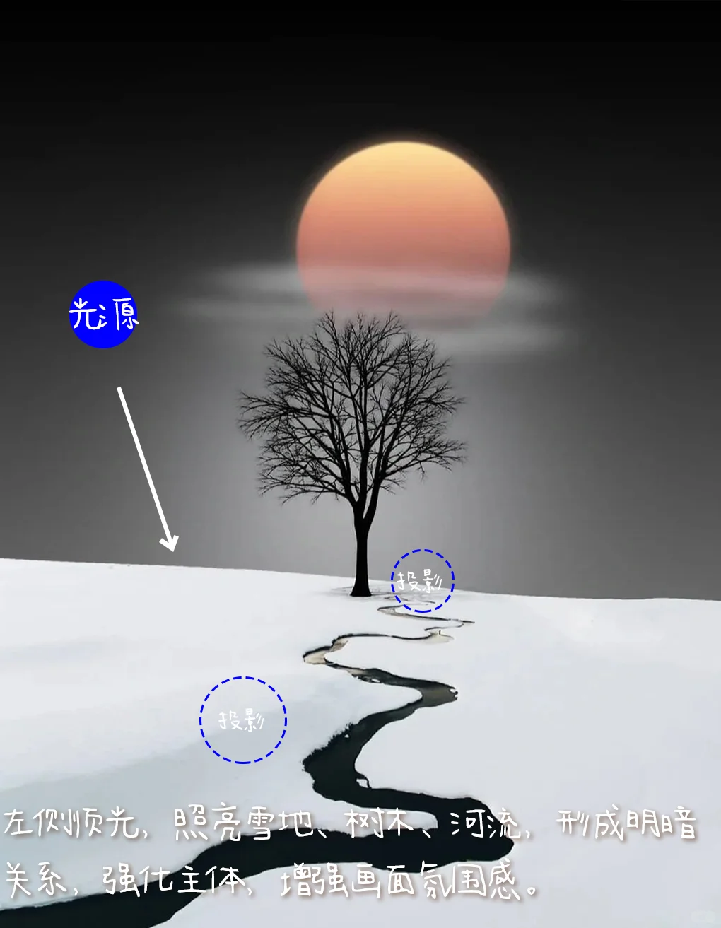 2.光线:左侧顺光,照亮雪地、树木、河流,形成明暗关系,强化主体,增强画面氛围感。