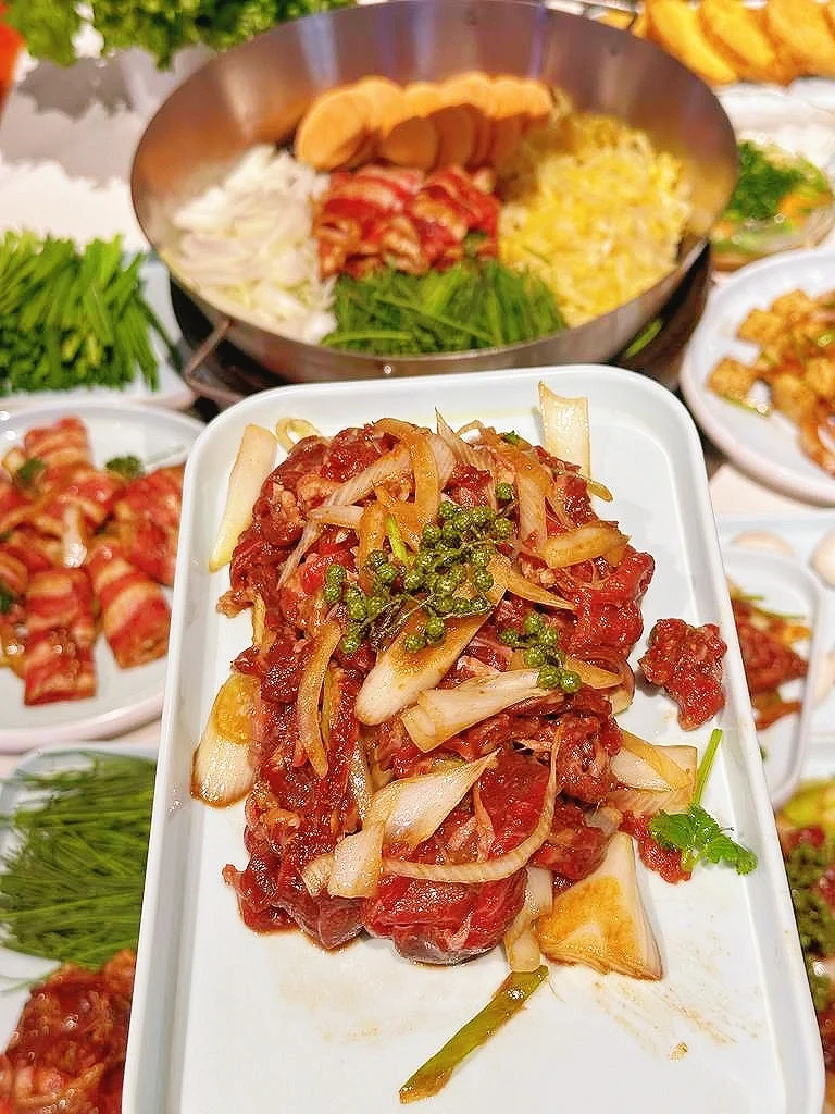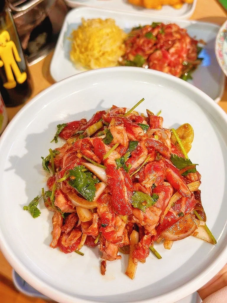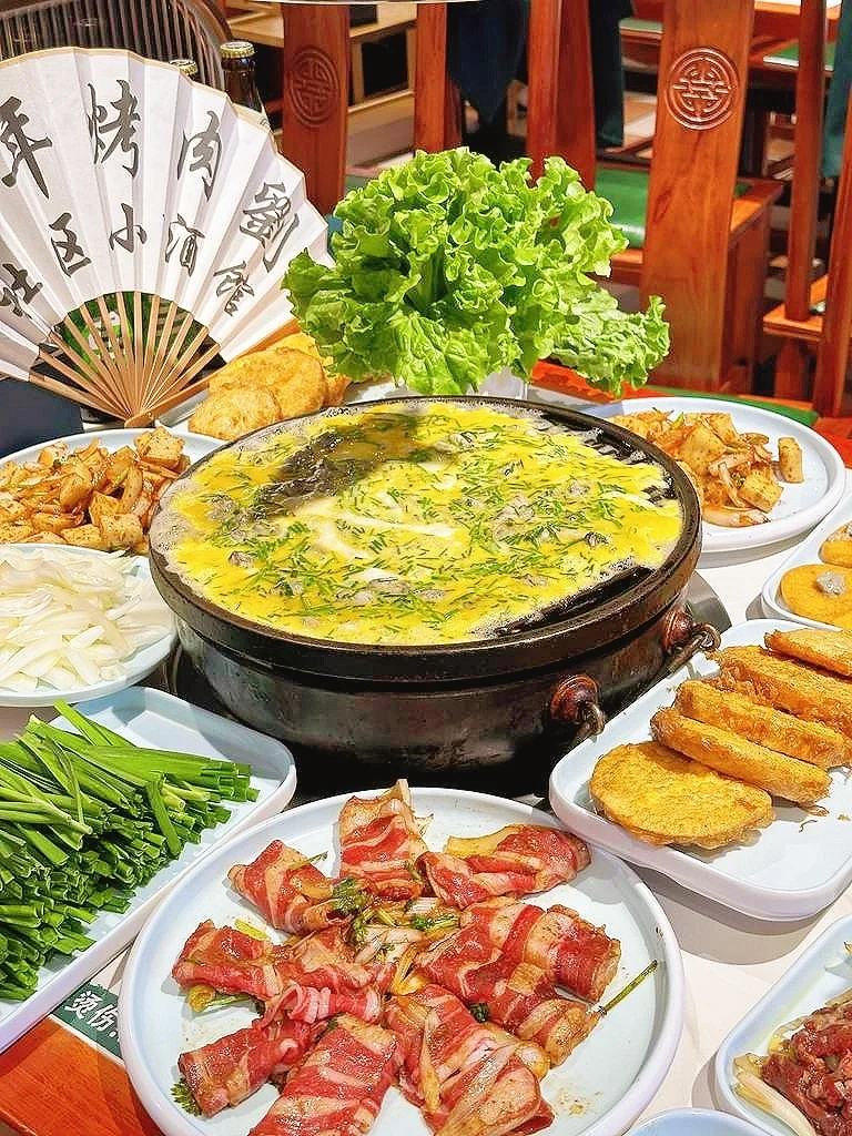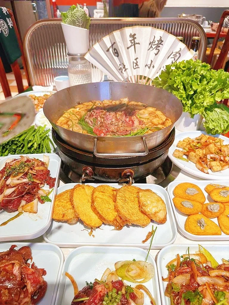 又和朋友们一起来到这里吃烤肉啦,环境是中式怀旧风,超有氛围~沙葱羊肉桌桌必点,羊肉嫩滑,沙葱清爽,也是招牌呀🏴☠️香辣鸡翅外皮焦脆,鸡肉鲜嫩,芝士玉米香甜拉丝,还有清甜柿子,店里热热闹闹的,边聊边吃快乐加倍!