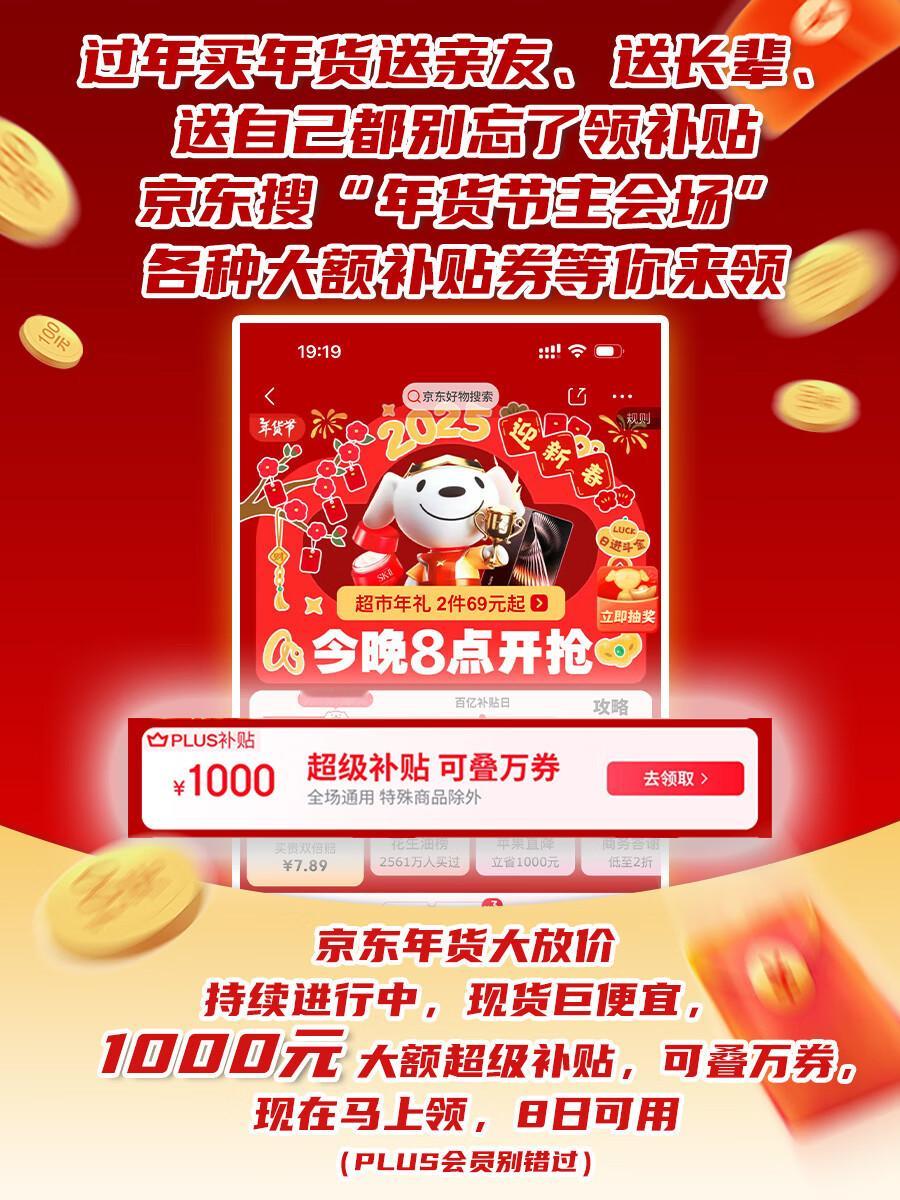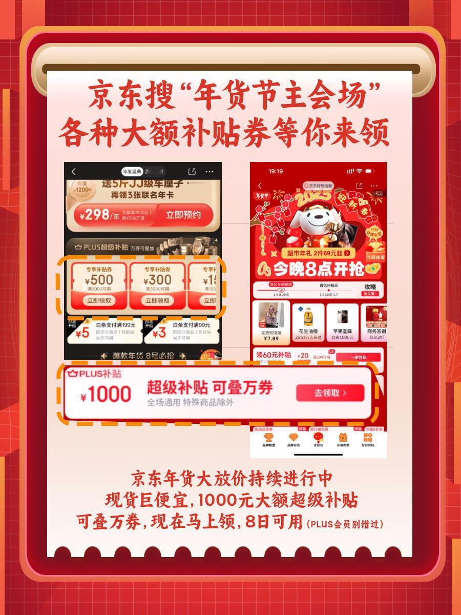 京东年货节1000元补贴 马上过年啦,除了京东谁还给我发这么大红包京东年货节,PLUS会员领1000元超级补贴券,可叠万券!!不仅全场直降,买年货还能多减60元,更有白条6期分期免息,京东搜“年货节主会场”每天都能领额外60元!不仅满减直降还能叠补贴!全品类5折!!