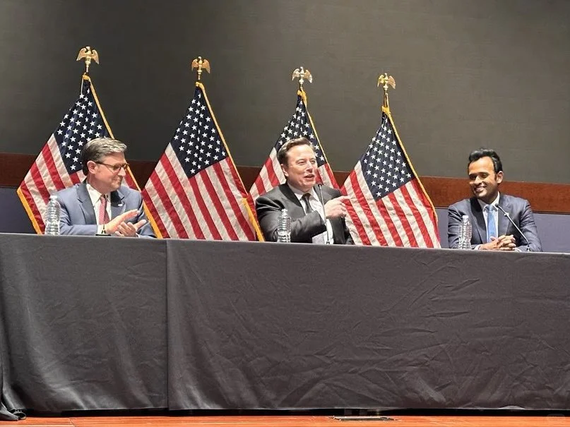 记者问:“埃隆·马斯克想把政府机构从 428 个减少到 99 个,能做到吗?” 议长约翰逊:“我们当然希望如此。”