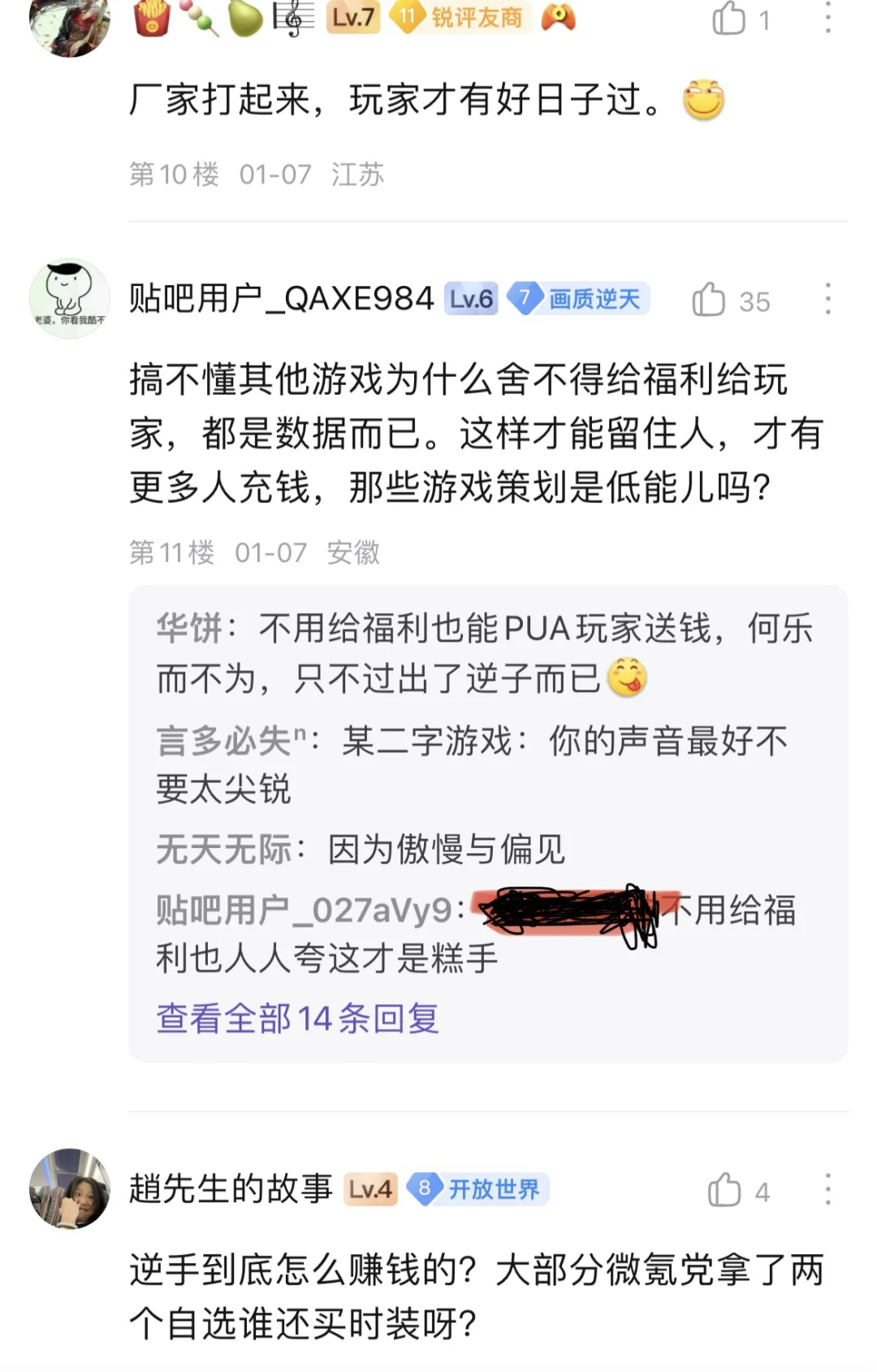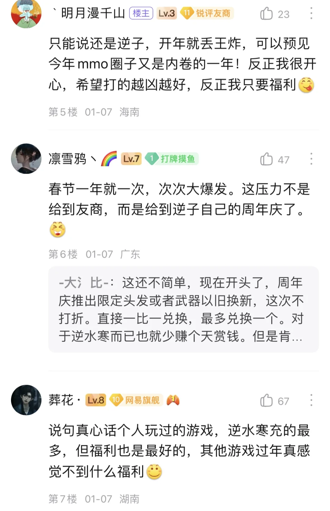 其实跟友商压根就不是一个赛道能有啥压力,同类型网游我也玩过三四个了,有的网游纯氪金收集养老,有的网游把成就系统做得很有意思消磨时间,有的网游靠开荒pve拉高在线率,逆手是最明显让我感到越玩越没意思的一个,适合新手但是时间长了玩不下去,宝宝巴士级别的团本,很扁平单一的探索系统。游戏最重要的还是好玩,近半年唯一值得称赞的是繁育系统,算是给逆手回了一波血,不然福利再好有啥用。