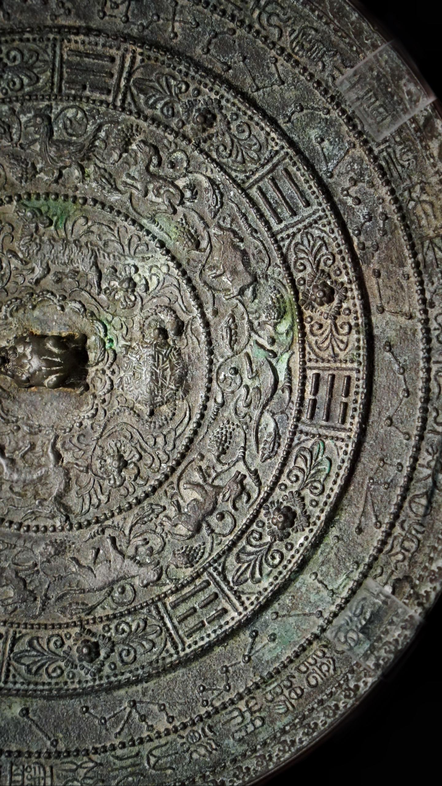第五圈饰54字铭文:长庚之英,白虎之精,阴阳相资,山川效灵,宪天之明,法地之宁,分列八卦,顺考五行,百灵无以逃其状,卍