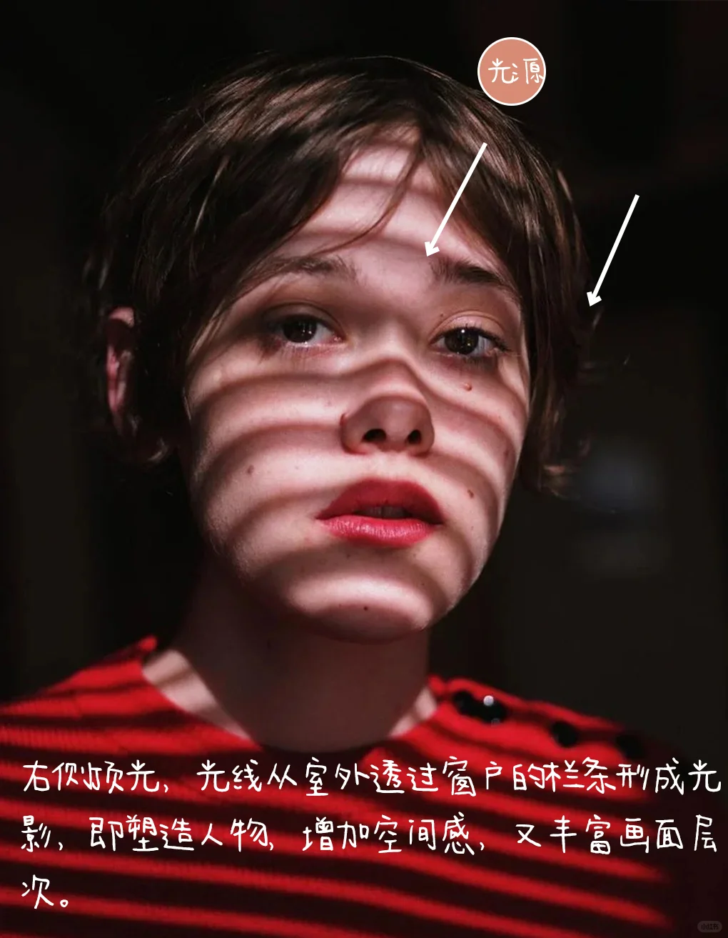 2.光线:右侧顶光,光线从室外透过窗户的栏条形成光影,即塑造人物,增加空间感,又丰富画面层次。