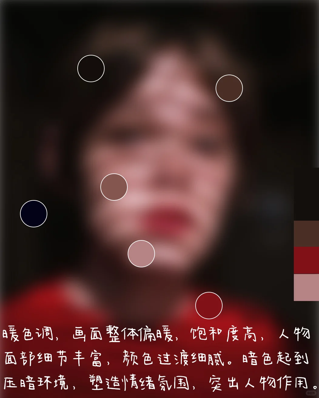 4.色调:暖色调,画面整体偏暖,饱和度高,人物面部细节丰富,颜色过渡细腻。暗色起到压暗环境,塑造情绪氛围,突出人物作用。
