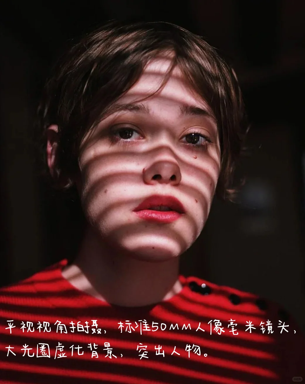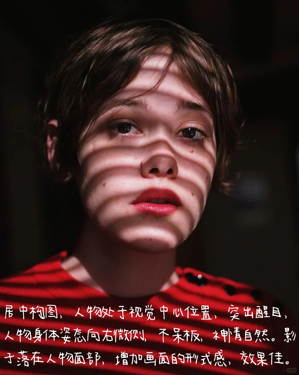1.构图:居中构图,人物处于视觉中心位置,突出醒目,人物身体姿态向右微侧,不呆板,神情自然。影子落在人物面部,增加画面的形式感,效果佳。
