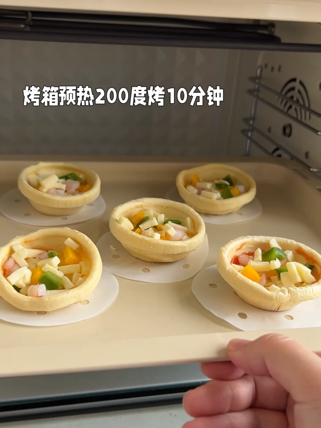 又来分享既美味又简单的宝宝美食了‼️蛋挞皮除了做蛋挞外,还可以巧变身成迷你版小披萨哦! 准备食材: 蛋挞皮、虾仁、蔬菜粒、瑞慕马苏里拉干酪碎 制作方法: 1.蔬菜粒焯水,捞出控干水分 2.蛋挞去外皮锡纸,先刷一层番茄酱,再依次放入马苏里拉干酪碎、蔬菜粒和虾仁。 3.放入烤箱 200度10分钟,就可以香香的出锅啦! 这个瑞慕马苏里拉奶香味十足,芝士拉丝绵长真的很好吃!而且它还是100%原制奶酪,6倍奶钙奶蛋白,是宝宝的营养补充好物哟!