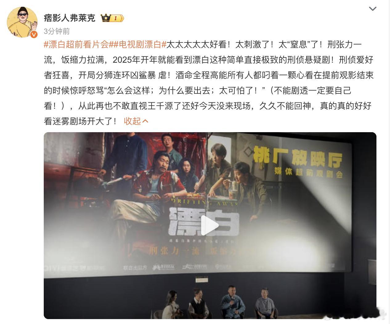 漂白超前看片会 电视剧漂白 《漂白》超前看片会的现场反馈太棒了!赵今麦在剧中的表现可圈可点,她把甄珍的破碎感演绎得十分到位,让人感同身受。郭京飞演警察已经驾轻就熟,他的表演为角色赋予了灵魂。王千源的反派形象太恐怖了,杀人怼脸的画面真的太惊悚。已经迫不及待想追《电视剧漂白》了,相信它会成为一部爆款剧!