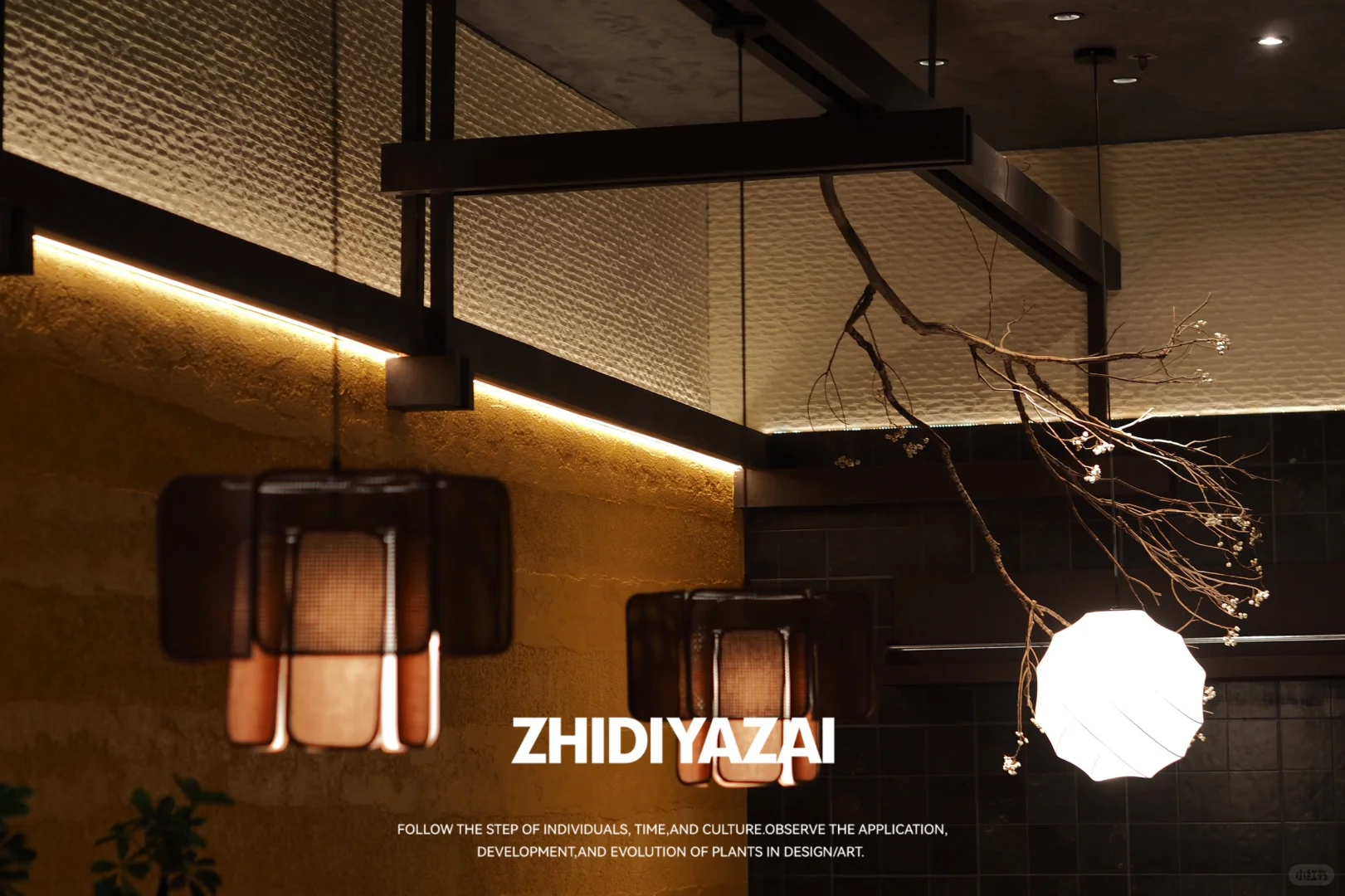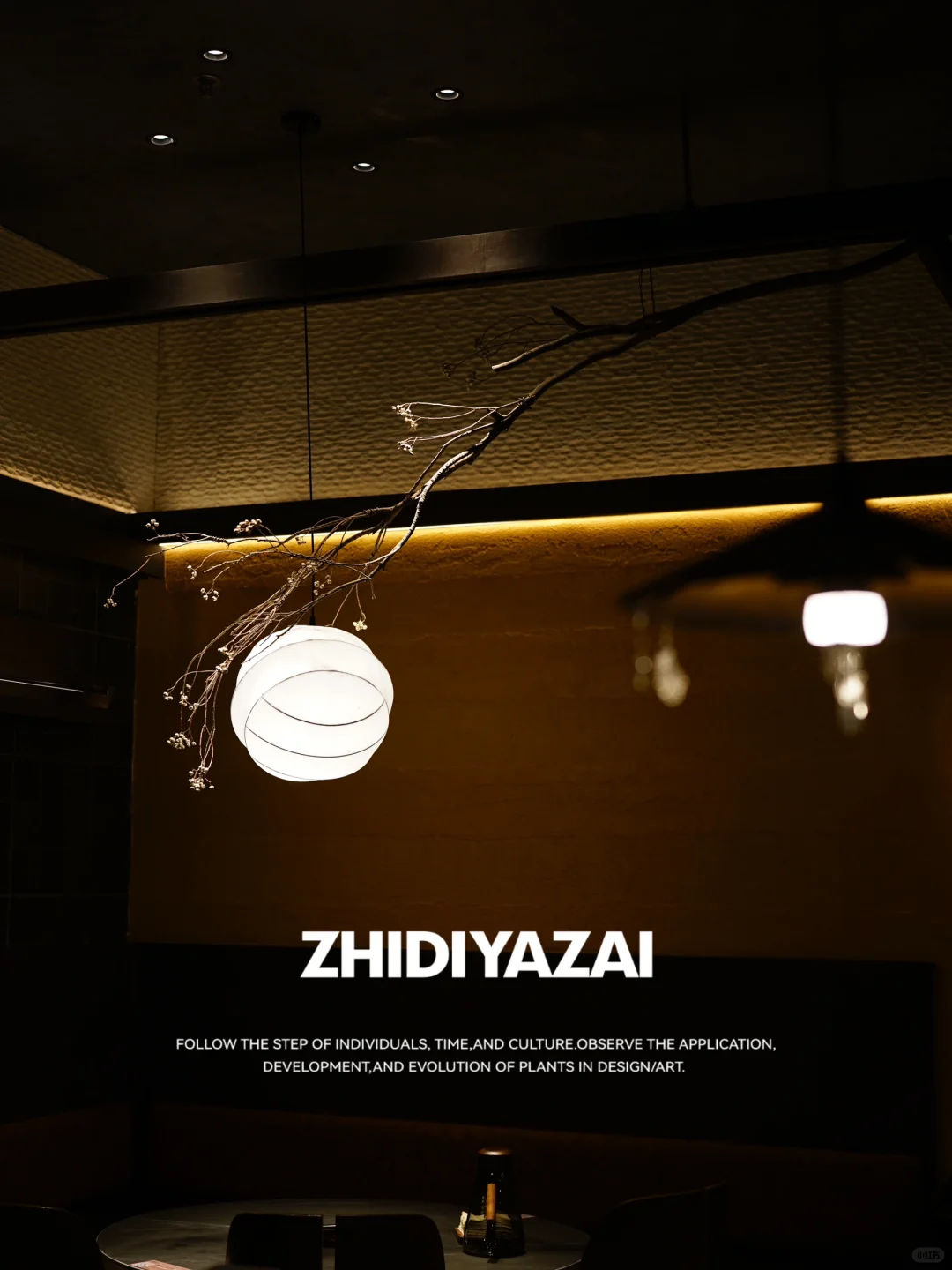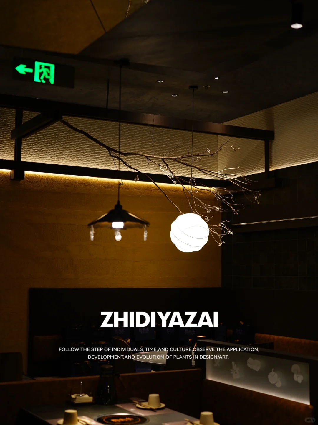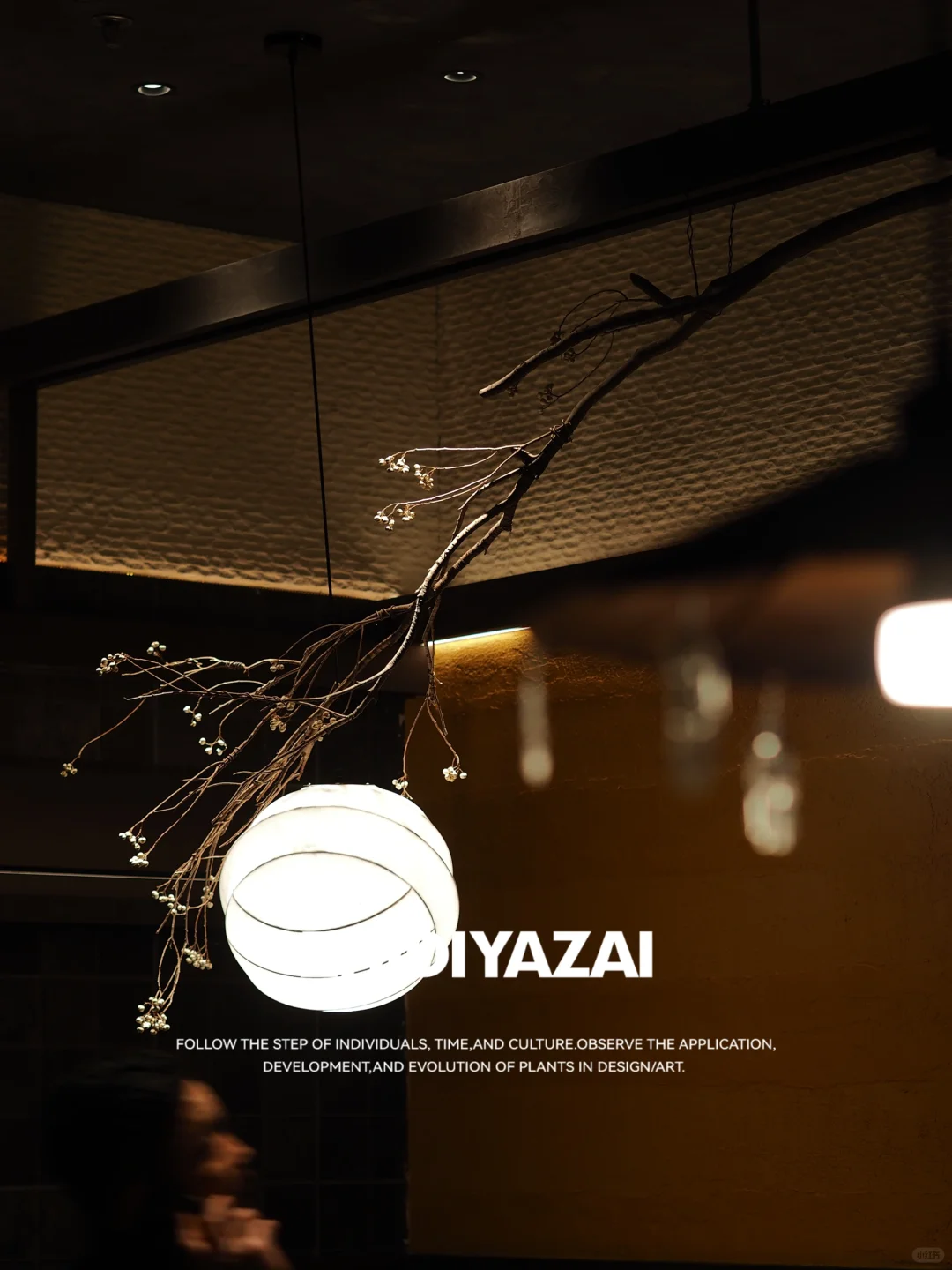 ❇️乌桕干支吊挂:左右两侧卡座区域上方打造枯木垂吊景观,挑选天然枯木作为景观主体,在树杈上均匀分布乌桕果,让枯木显得不那么单一,也更具观赏性.