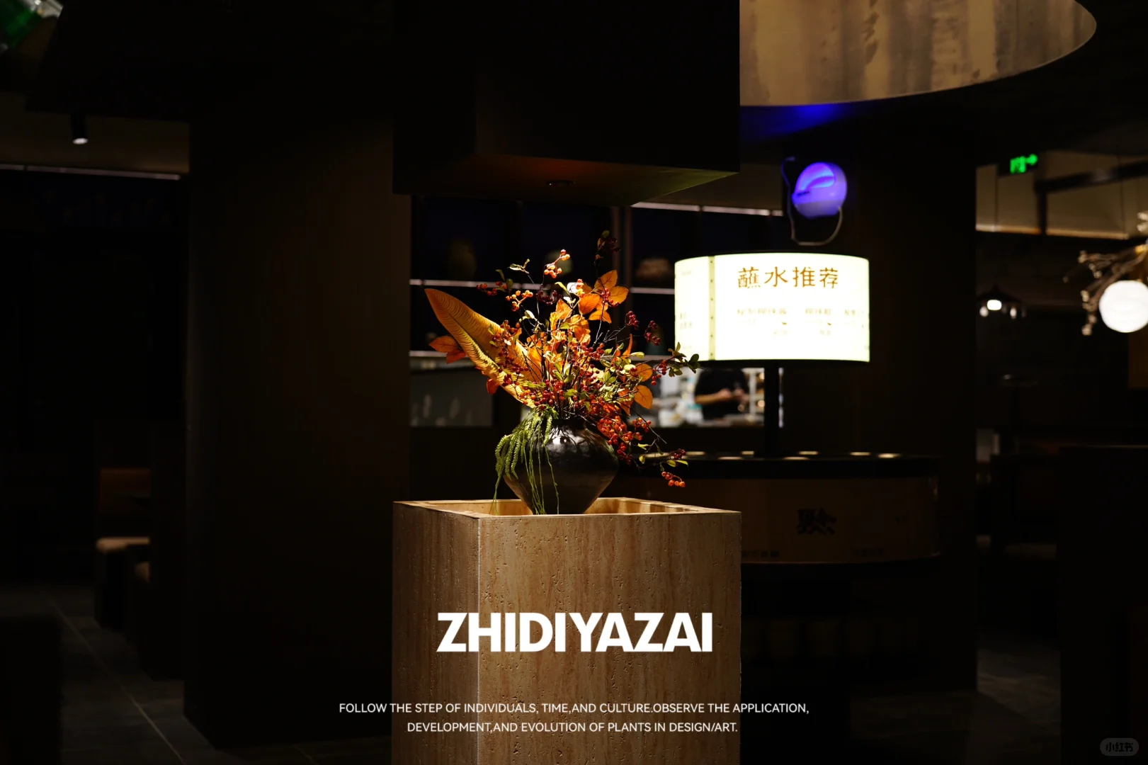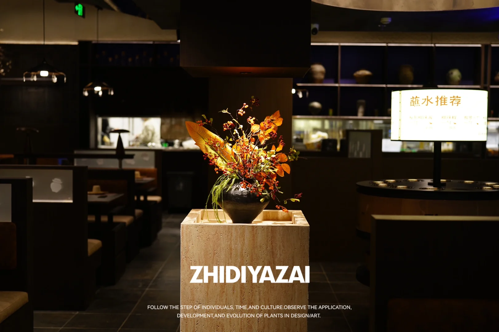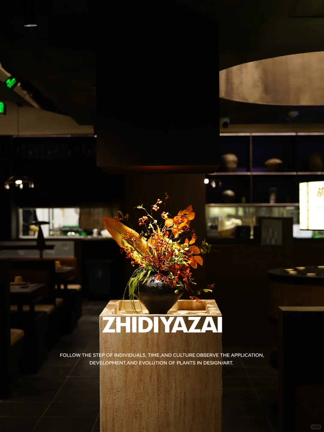 ❇️中央导台上用仿真花艺,果实,搭配深色釉面老坛盆器,作仿真插花,适当提亮店内较为暗的空间环境.