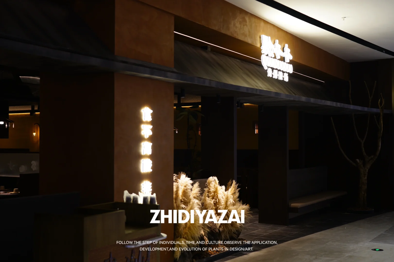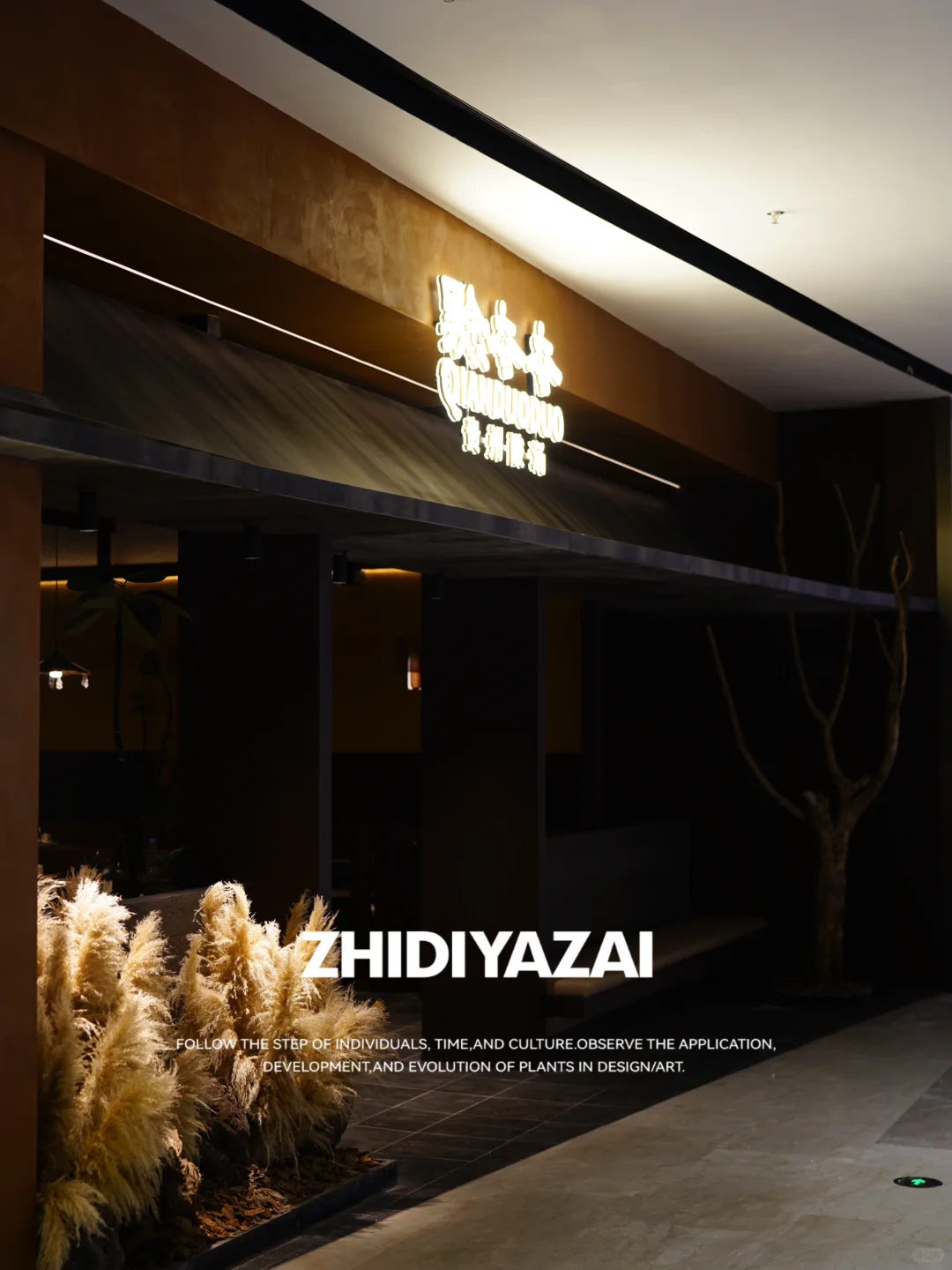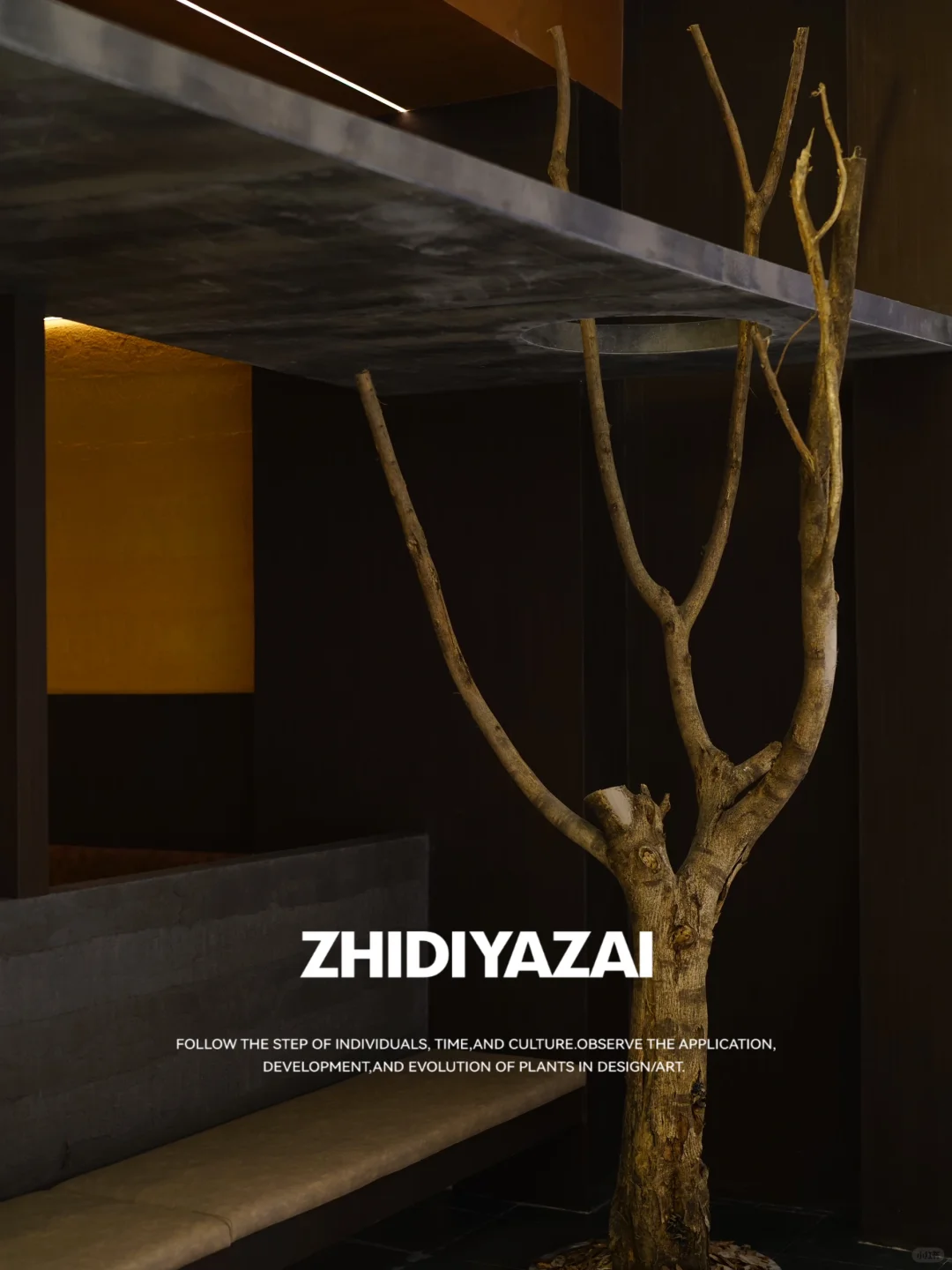 ❇️迎客树:挑选到一颗高度3米的树干做单一枯木景观,最高树杈从门头上沿的顶洞中穿过,好似链接了门头与店面.