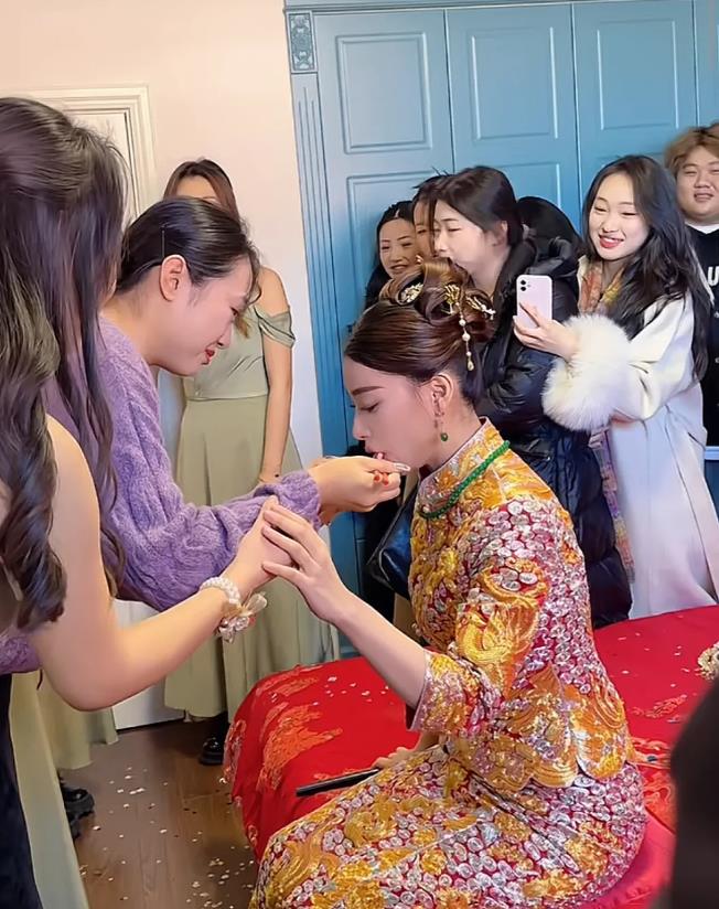 一旁的小姑子原本洋溢着幸福笑容的脸庞也渐渐被感动与不舍所取代,她微微凑近嫂子,配合着嫂子的动作。