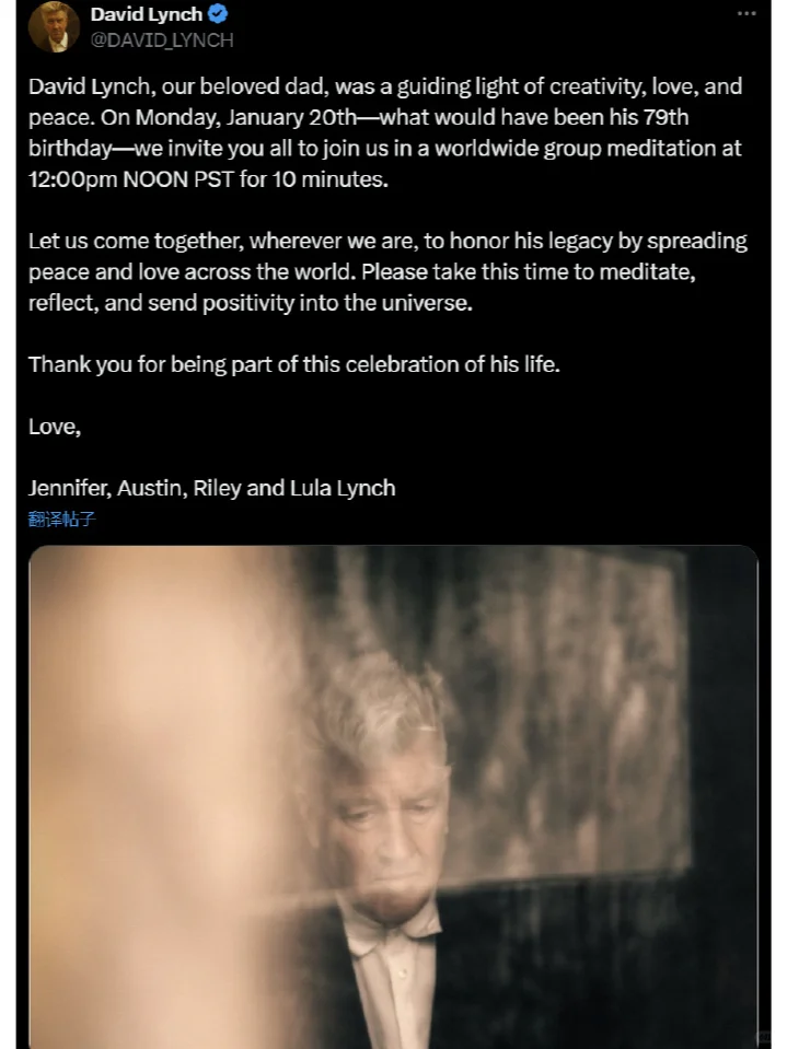 “大卫·林奇,我们敬爱的父亲,是创造力、爱与和平的指路明灯。在1月20日星期一,也就是他79岁生日那天,我们邀请大家在太平洋标准时间中午12:00加入我们的全球集体冥想,时间为10分钟。”