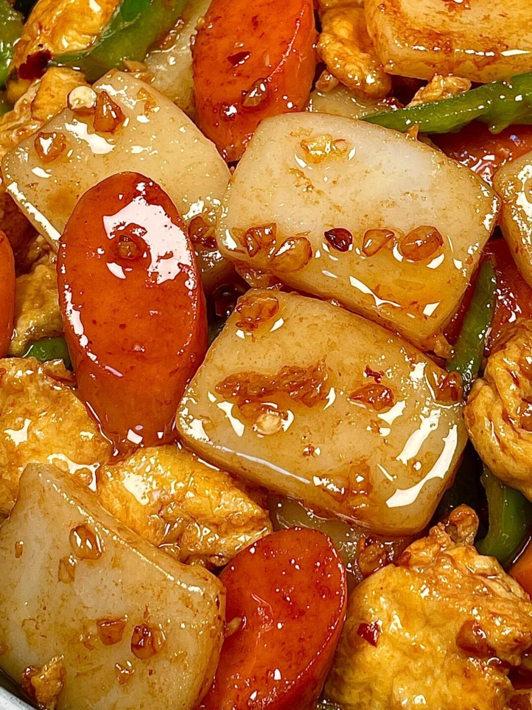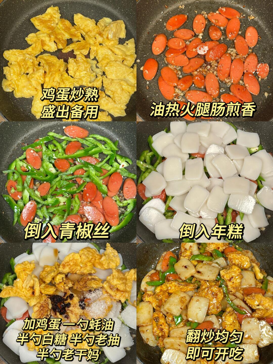 放入年糕、鸡蛋、火腿肠,加生抽、老抽、蚝油、盐、糖调味,翻炒均匀即可。