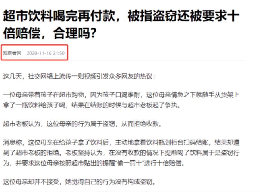 信源:(观察者网 2020年-1-16 超市饮料喝完再付款,被指盗窃还被要求十倍赔偿,合理吗?)