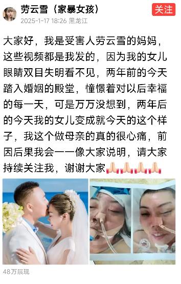 女子刚新婚两月,因为没给丈夫游戏充钱,被家暴致双目失明,并且失去生活自理能力。 父母倾其所有,带她四处求医,法院一审判决男方有期徒刑11年,但医药费却不愿承担。 男方家里特别有钱,给了三万六就再也不给了,女子治病却没有钱。 受害人劳云雪的妈妈发视频求助,希望重判男方,最好能判无期。 故意伤害,就是犯罪,不要说什么家暴,不要打着婚姻的外衣,而减轻惩罚,就因为是你的老婆,就被故意把人打成这样? 好好的姑娘,现在生活不能自理,太残忍了!