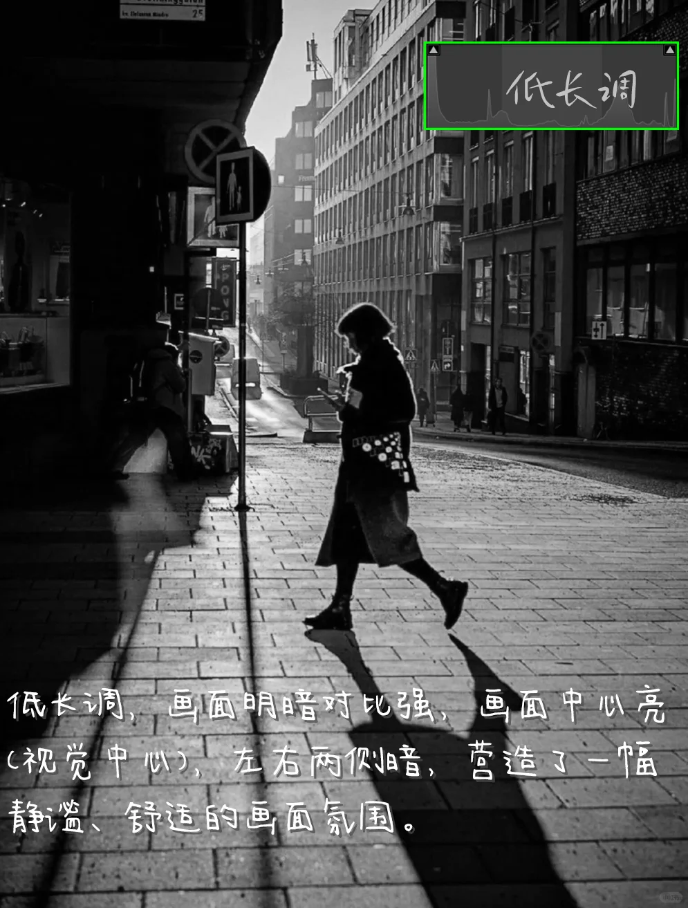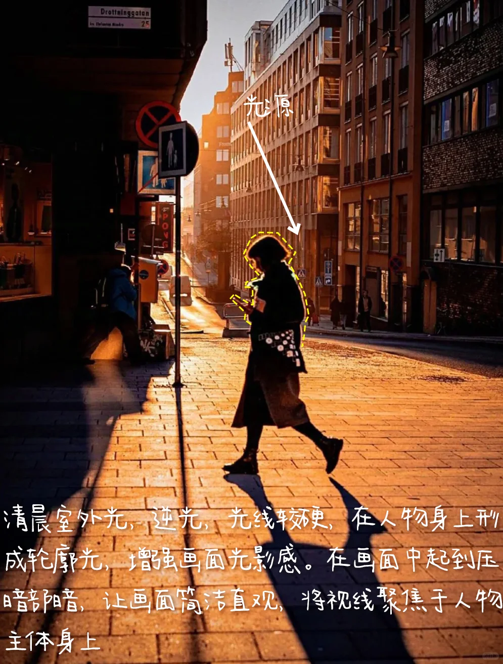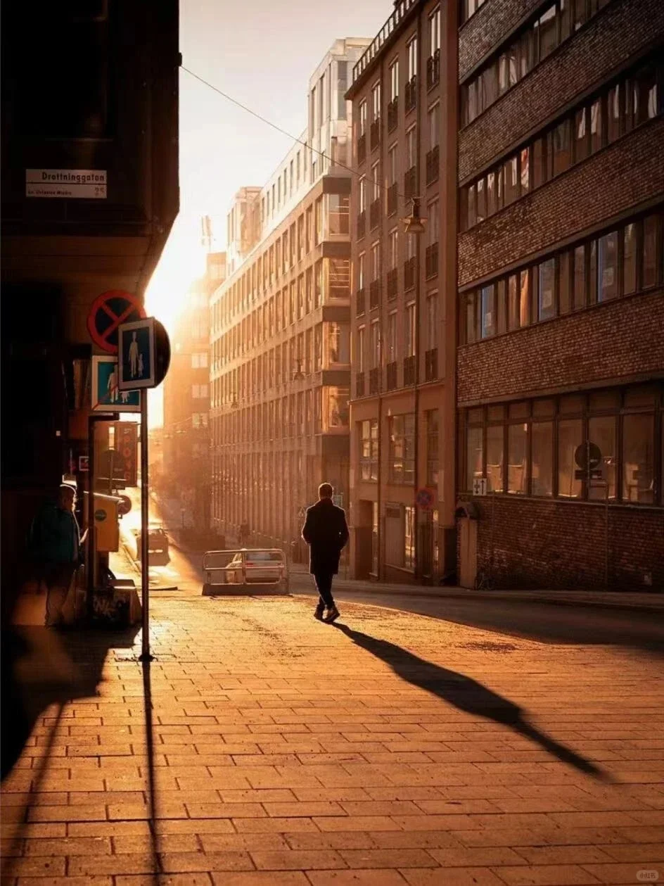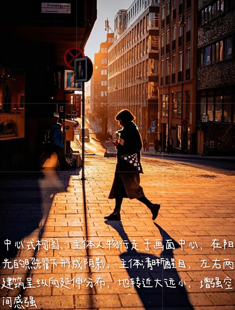 1.构图:中心式构图,主体人物行走于画面中心,在阳光的照耀下形成阴影,主体清晰醒目,左右两建筑呈纵向延伸分布,地转近大远小,增强空间感强。