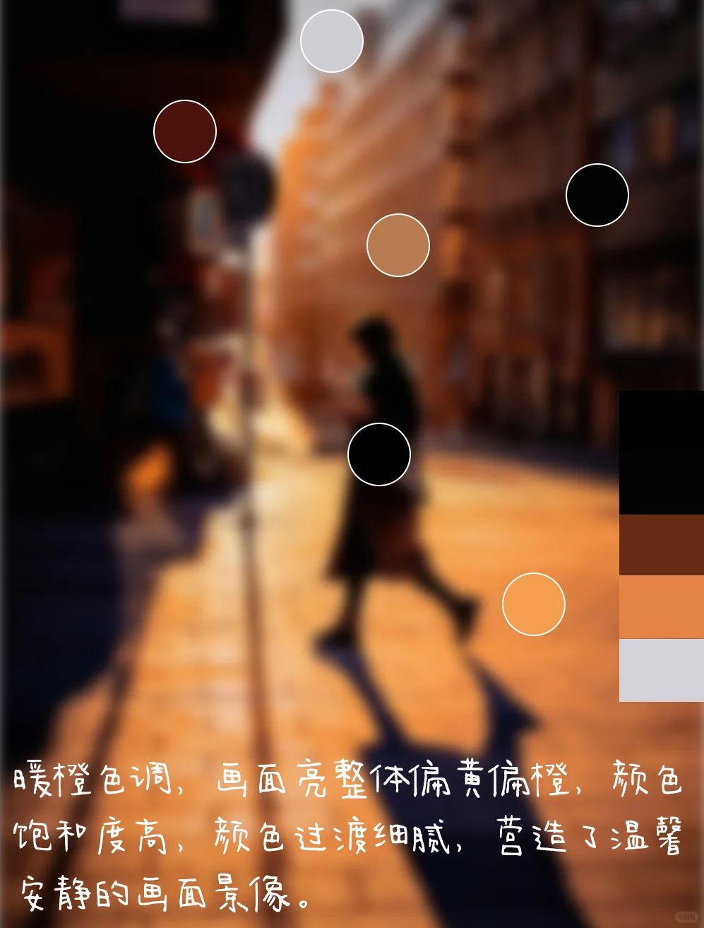 4.暖橙色调,画面亮整体偏黄偏橙,颜色饱和度高,颜色过渡细腻,营造了温馨安静的画面景像。