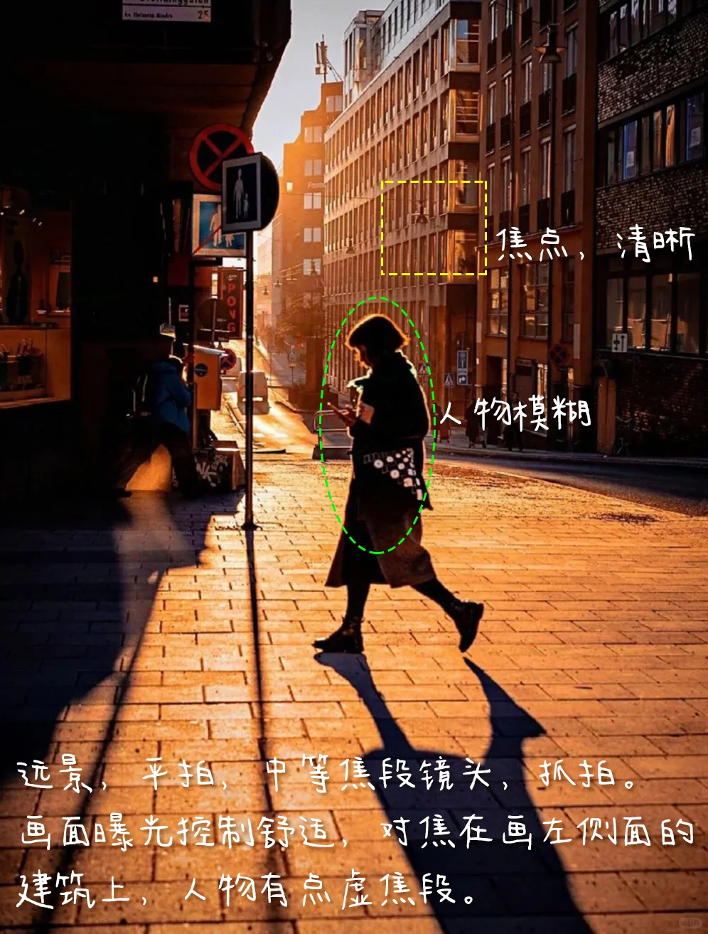 5.拍摄:远景,平拍,中等焦段镜头,抓拍。画面曝光控制舒适,对焦在画左侧面的建筑上,人物有点虚焦段。