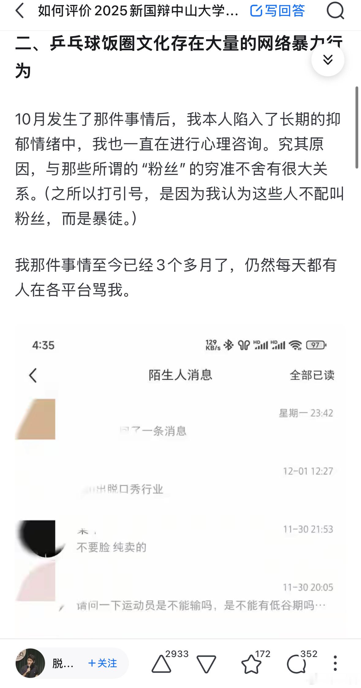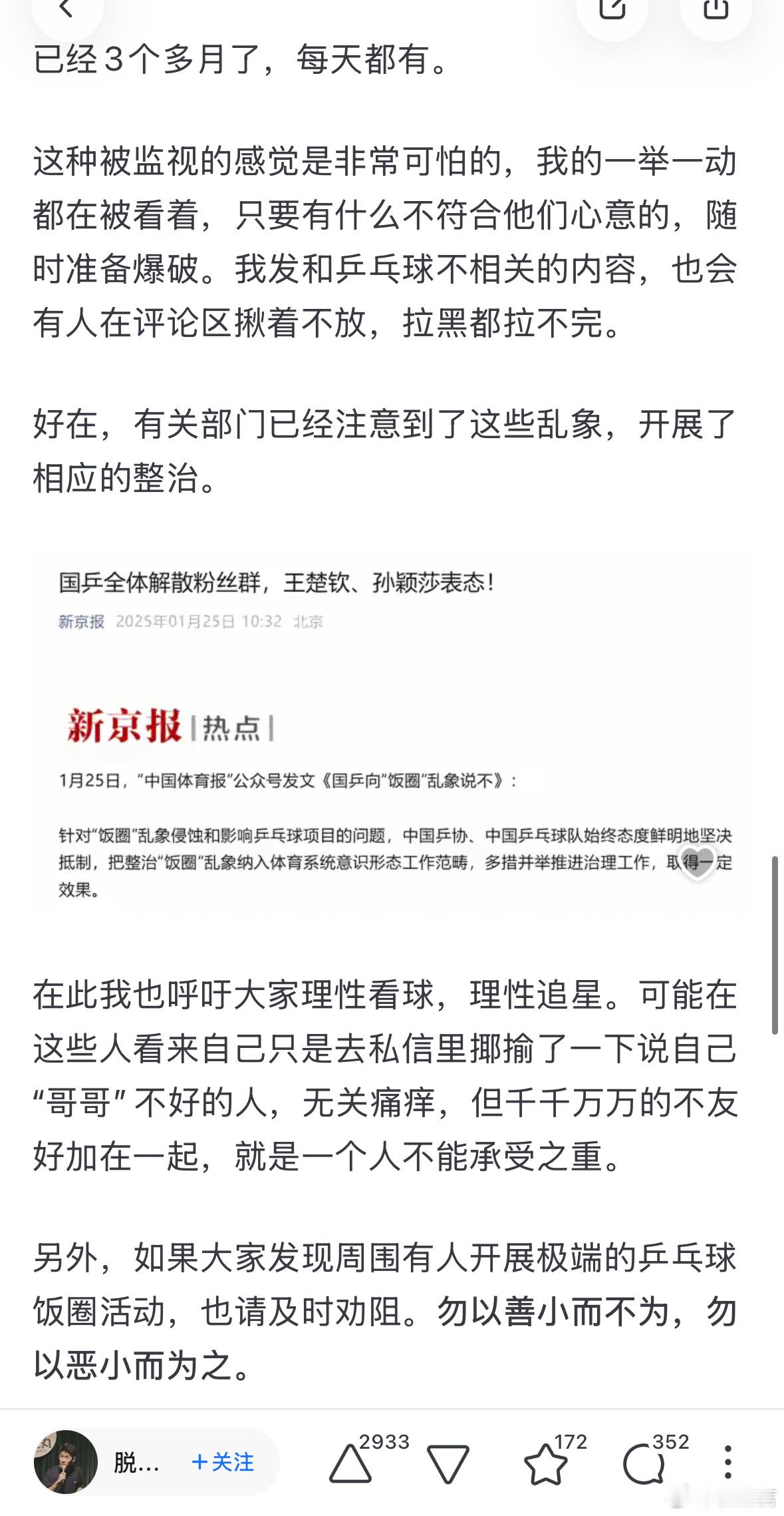 曾因调侃王楚钦而遭开除的脱口秀演员瘦子表示“10月发生了那件事情后,我本人陷入了长期的抑郁情绪中,我也一直在进行心理咨询。究其原因,与那些所谓的“粉丝”的穷准不舍有很大关系。(之所以打引号,是因为我认为这些人不配叫粉丝,而是暴徒。)”