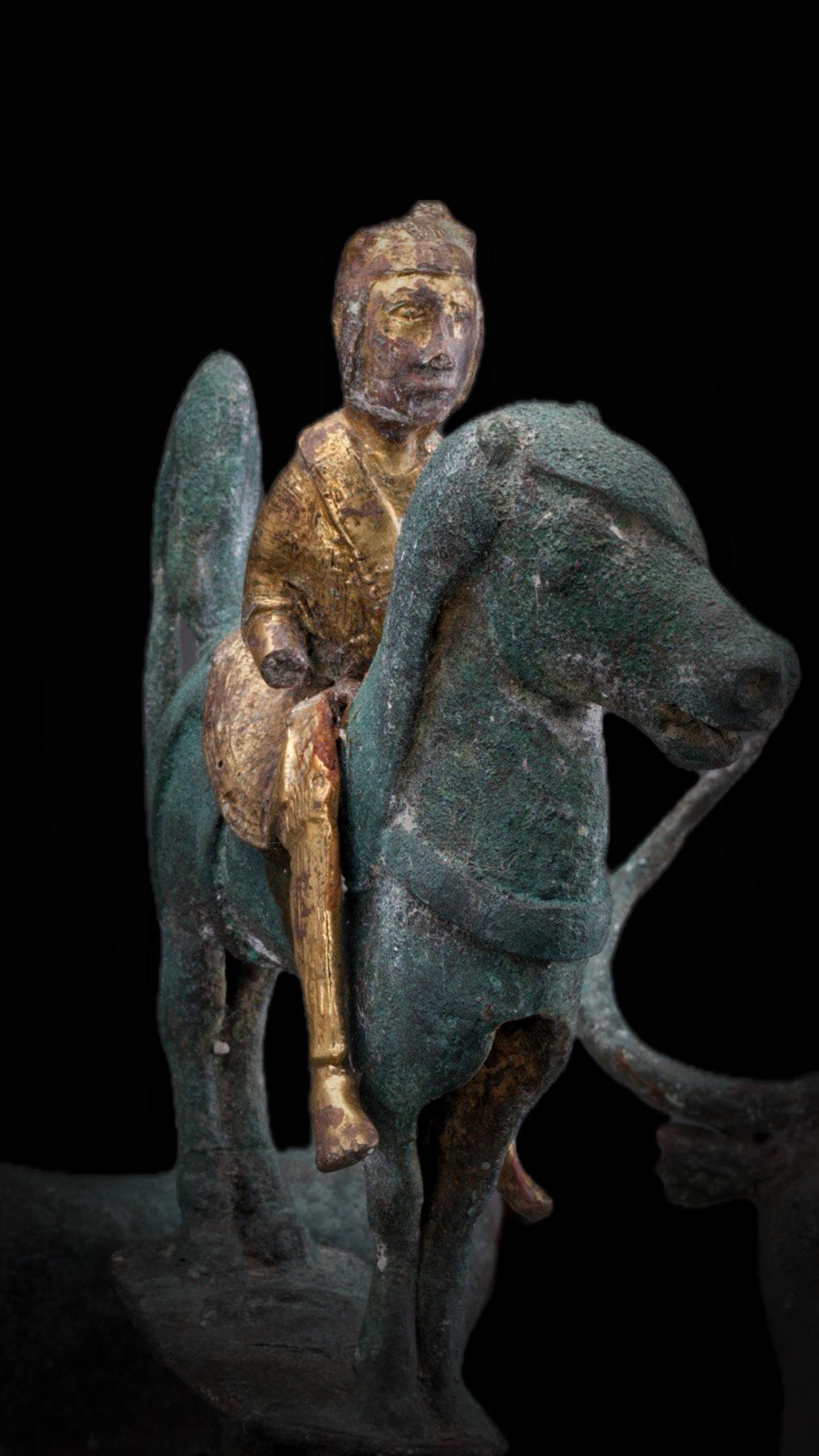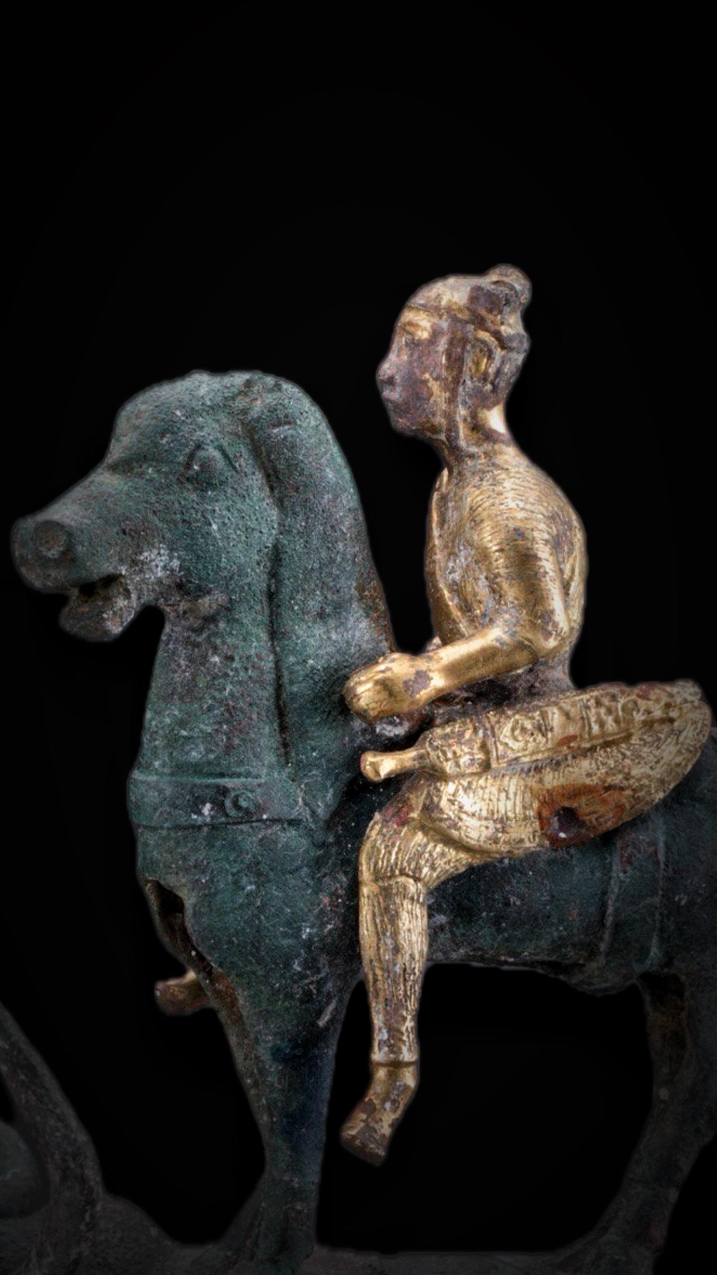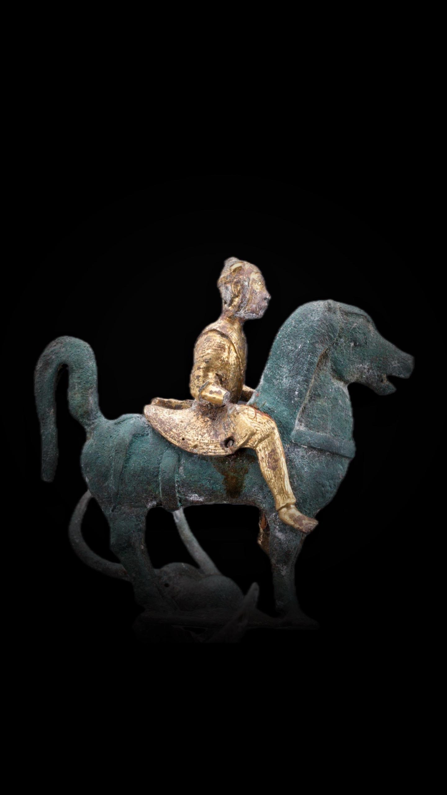 中心有一个圆柱柄托盘,托盘上有一身佩宝剑的滇族骑士,通体鎏金,骑一高头大马,英勇威武