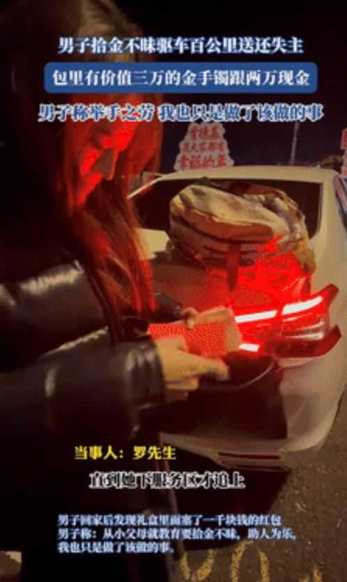 “这个女人不简单!”武汉,美女丢失3万的黄金和2万元现金,小伙拾金不昧归还!美女想给红包被拒,改送2箱特产,小伙打开一看却瞬间泪目了!网友:这是应得的,毕竟连微信支付宝提现都要手续费呢。 一个拾金不昧,一个心怀感恩,这两位都是敞亮人,究竟怎么回事呢?海报新闻的消息,1月22号,罗先生和朋友在武汉的一个服务区停车休息时,发现刚刚开走的那辆车的位置上有一个行李包丢在地上,一看就知道估计是车主马虎大意忘放进后备箱了。 为了避免出现引起误会,罗先生就特意录着视频,然后记下了车牌号,他说当时自己虽然想叫住那辆车,但是不知道对方的名字,更没有对方的联系方式,反应过来时显然已经来不及了。 而这个行李包里的东西也让他吃了一惊,里面不仅放着价值三万多的金手镯,甚至还有20000块的现金,看到这里罗先生哪里还敢耽搁,赶紧开车去追。 没想到这一追就是上百公里,直到那辆车下了服务区他们才追上,当车门被打开时,里面的美女车主还有些吃惊,她在这个时候才发现自己的包丢了。 女车主也是个敞亮人,见人家不仅拾金不昧,还烧了一百多公里的油追自己的车,随后她当场抽出许多现金要感谢罗先生,但是罗先生却表示这只是顺手的事,所以强烈的推辞说不要。 女车主灵机一动,去车上取了两箱特产作为这次的答谢礼,罗先生也觉得再拒绝下去有些不近人情,最终还是收下了,可是他万万没想到,到家的时候一打开箱子,发现里面竟然被女车主偷偷塞了1000元现金,虽然不是啥惊天动地的大事,却让人非常感动。 对此有网友表示:上次我捡了个手机,那人硬要给我发红包,我不要,结果她问我电话,给我充了几百块电话费。 也有网友说:我有几个朋友开网约车的,经常捡到手机,乘客答应给回司机空跑车过来的车费,就二三十块钱,结果到了不给也就算了,有得乘客在送都不体谅,要求我朋友立刻先送手机,不然报警,你说这都什么人...... 还有网友认为:得亏螺狮粉他亲自开箱了,万一转送给别的亲戚朋友,红包也出去了。 在笔者看来,善良的人遇到了懂得感恩的人,不得不说这两位都是有格局的人,一个追赶了上百公里,心中装满了原物奉还的责任,一个更是用实际行动在证明感恩的诚意是无价之宝,双向奔赴的温暖才是世上最让人感动的瞬间。 在这个快节奏的时代,真诚的流露也是最美的风采,传递爱与善良,愿咱们每个人啊都能像他们一样,在平凡中绽放出自己的一束微光,关于这件事你还有什么想说的,欢迎在评论区留言我们一起交流。