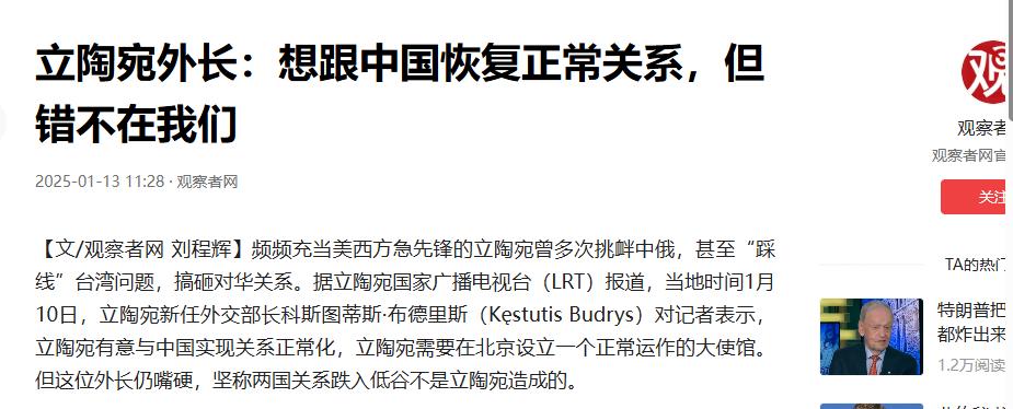 立陶宛的新任外交部长布德里斯啊,最近就公开表示,想跟中国恢复外交关系,还想在北京设立大使馆呢。但是呢,他又说,现在两国关系的恶化不是立陶宛的责任,这简直就是耍无赖嘛!