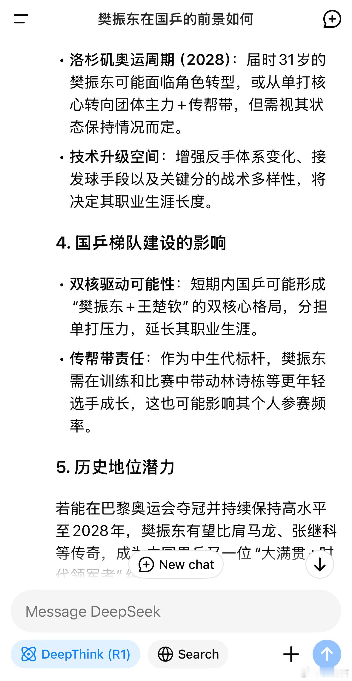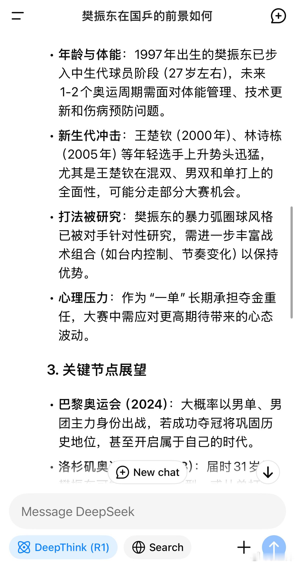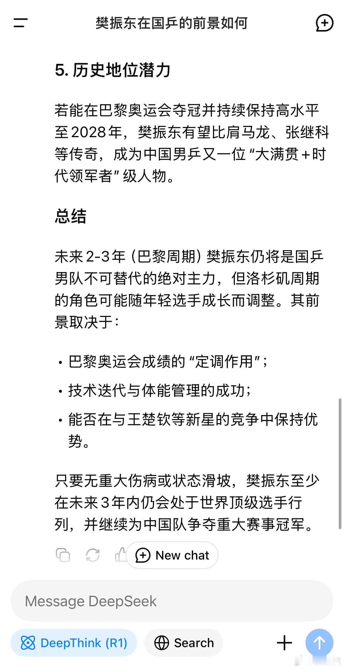 询问DeepSeek关于樊振东在国乒的前景。说实话,回答有些滞后。或许这块不是D
