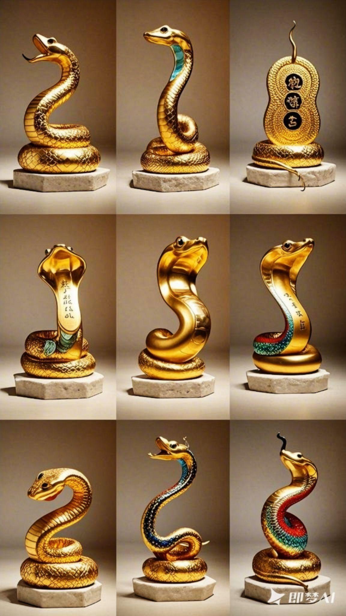 九宫格展示,九种形态各异的金灿灿的蛇形摆件,摆件底座镌刻“蛇么都好”,精致,绝版