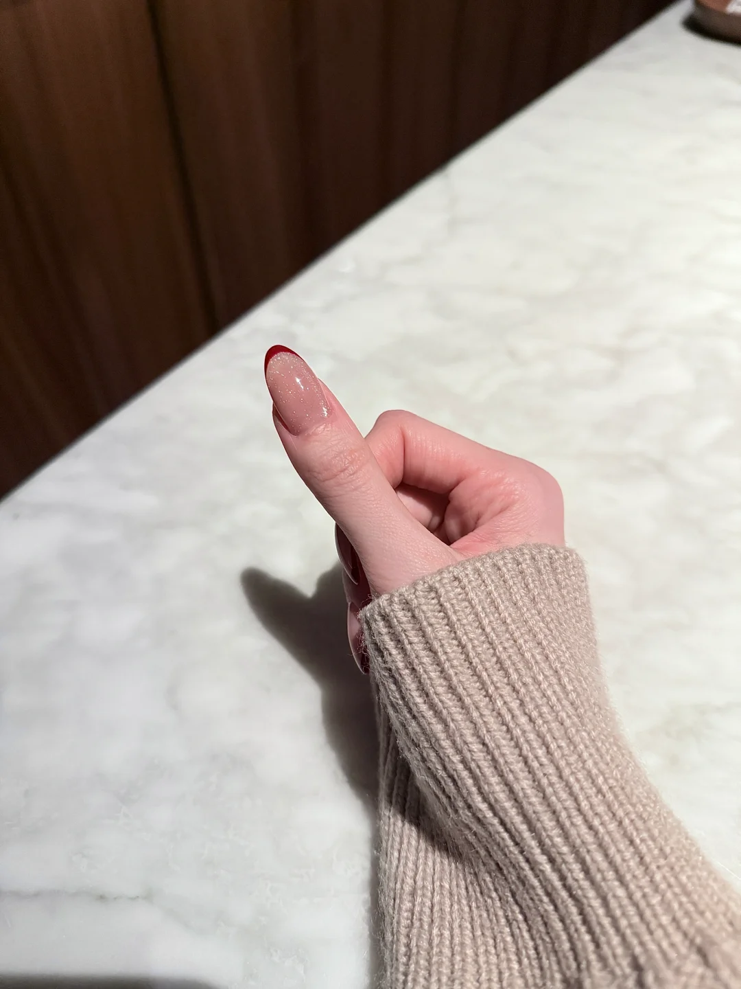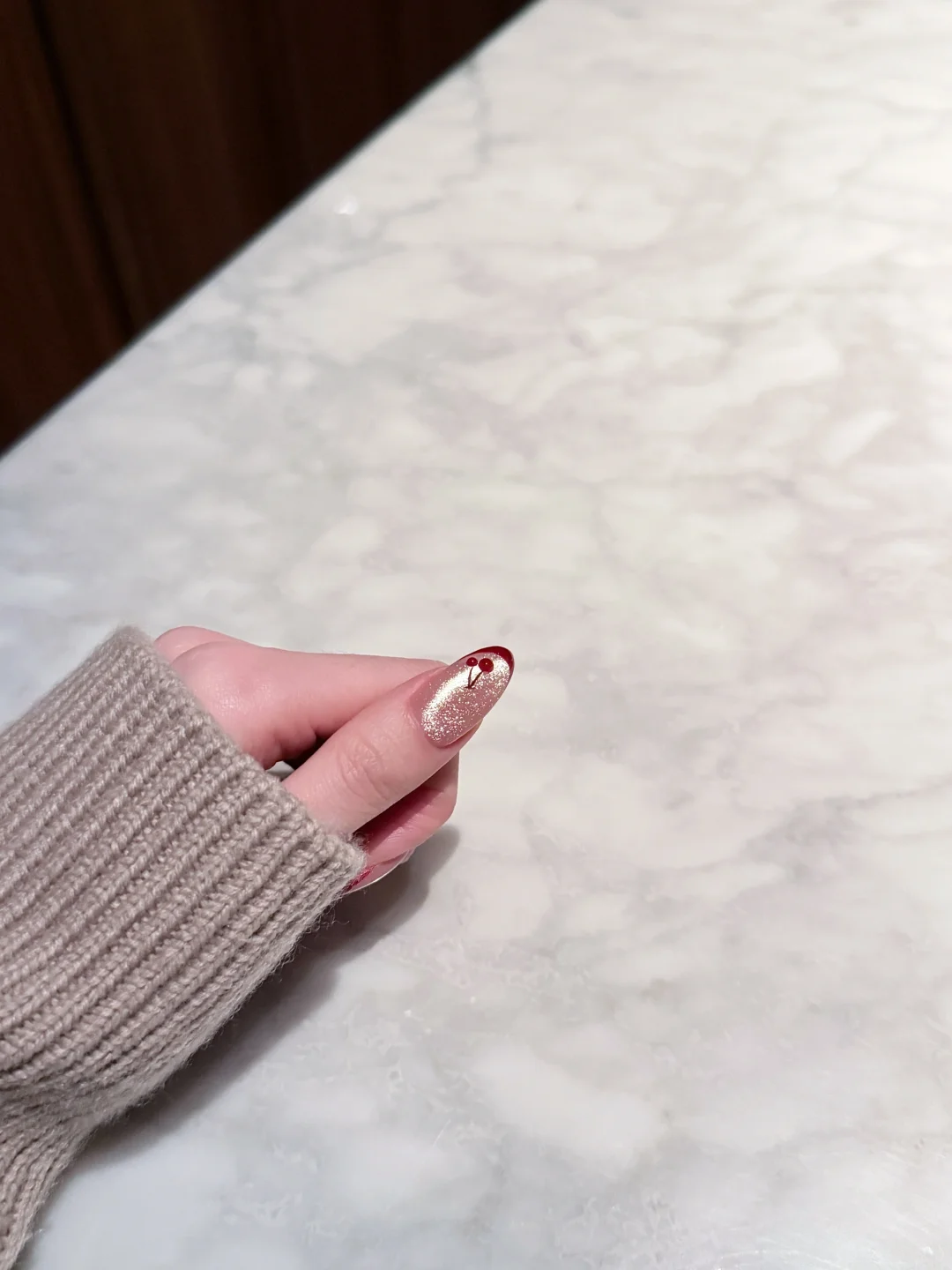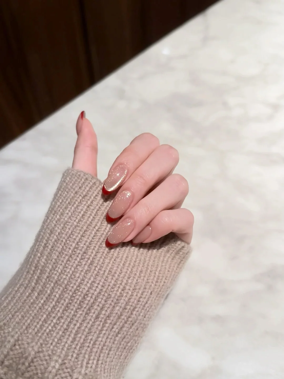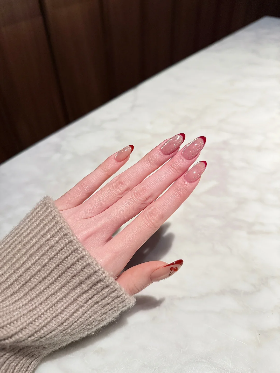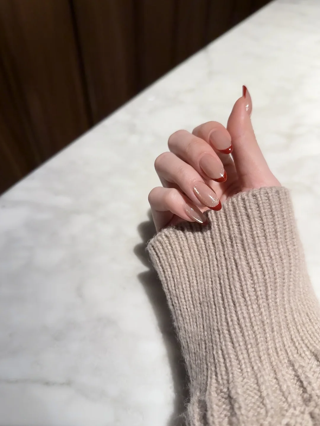 终于赶在年前做好了新年战甲了! 随手一拍都超级闪~神仙AB面❤️因为是侧吸 所以正面看是裸色!侧面就超级闪✨ 裸色打底+香槟色猫眼(侧吸)+樱桃红法式美甲🍒 真的太米了!新年第一幅就这么美~之后的美甲一定更美呀🫶🏻提前祝bb门新年快乐🎉