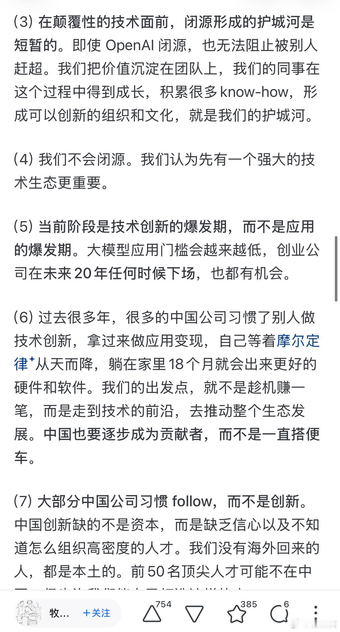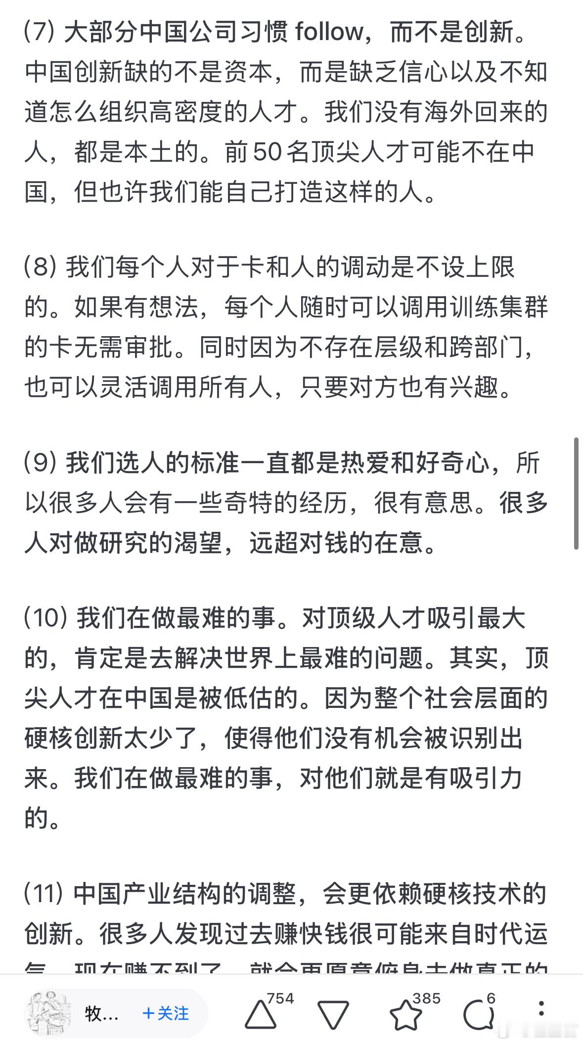 “大部分中国公司习惯 follow,而不是创新。中国创新缺的不是资本,而是缺乏信心以及不知道怎么组织高密度的人才。我们没有海外回来的人,都是本土的。前50名顶尖人才可能不在中国,但也许我们能自己打造这样的人。”