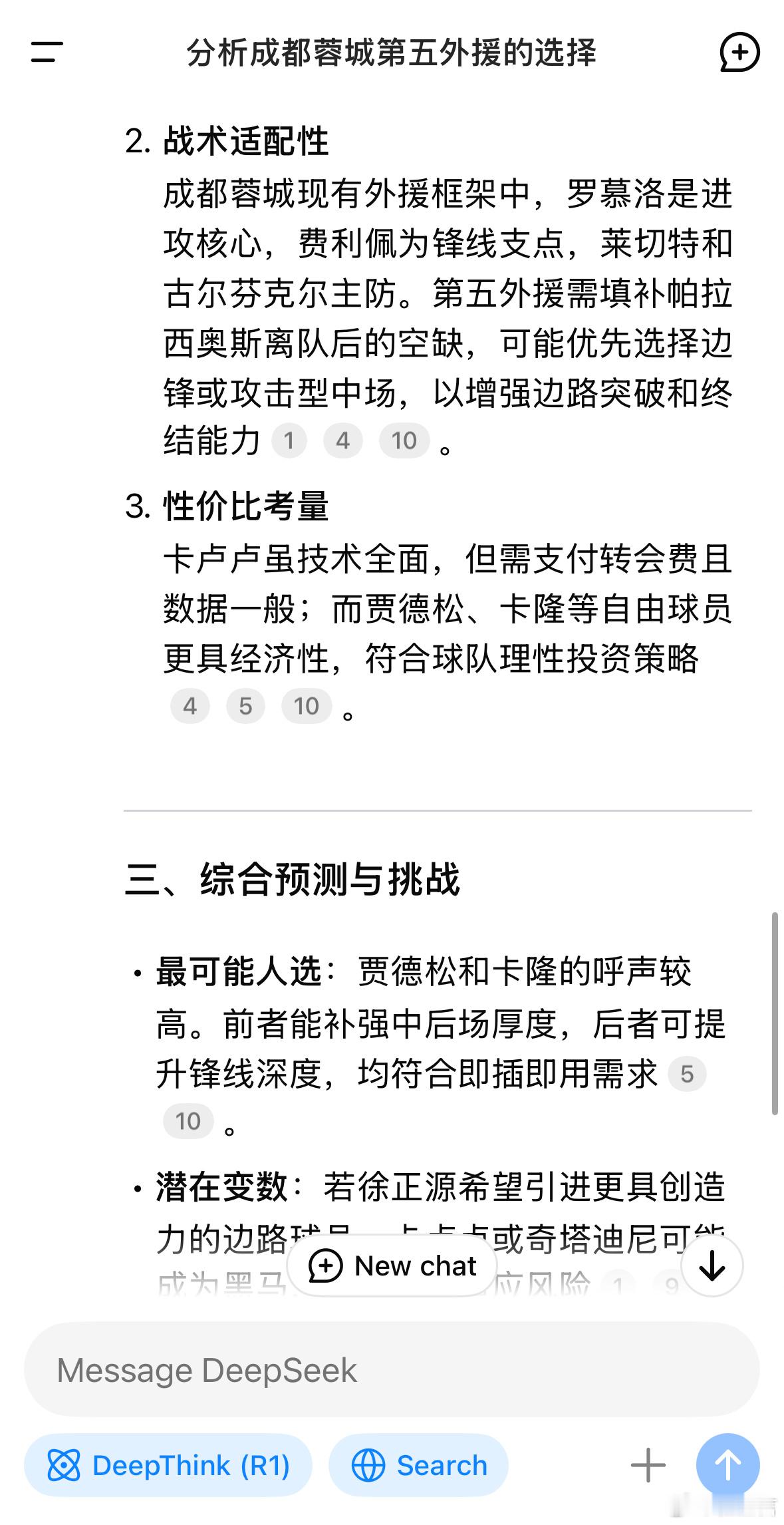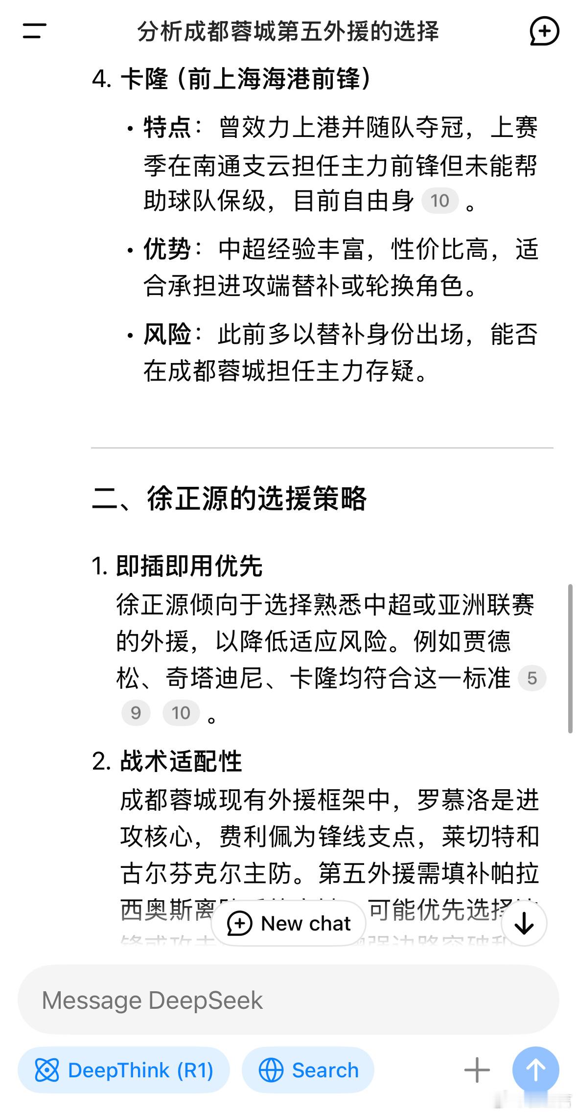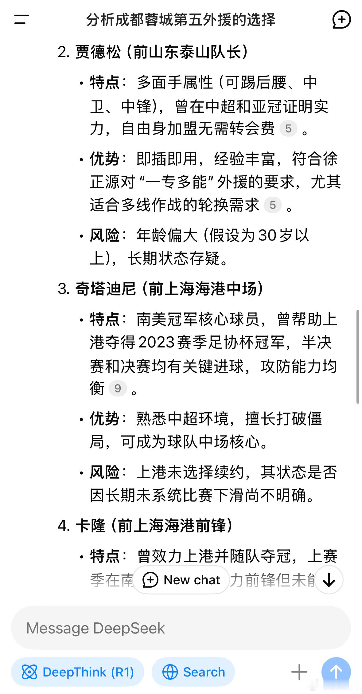 询问DeepSeek关于成都蓉城第五外援的分析,出现了四个名字:卡卢卢,贾德松,奇塔迪尼和卡隆。