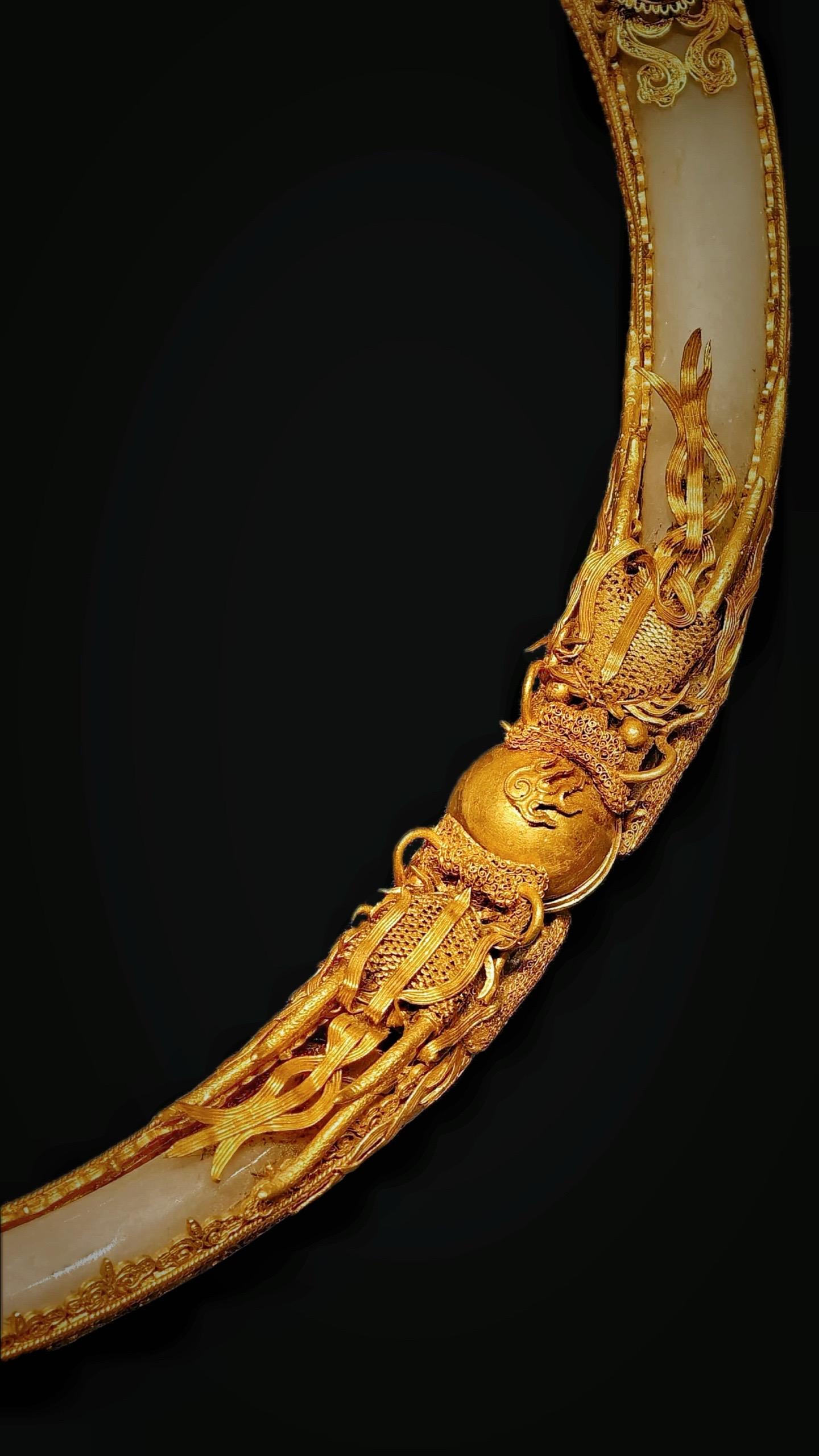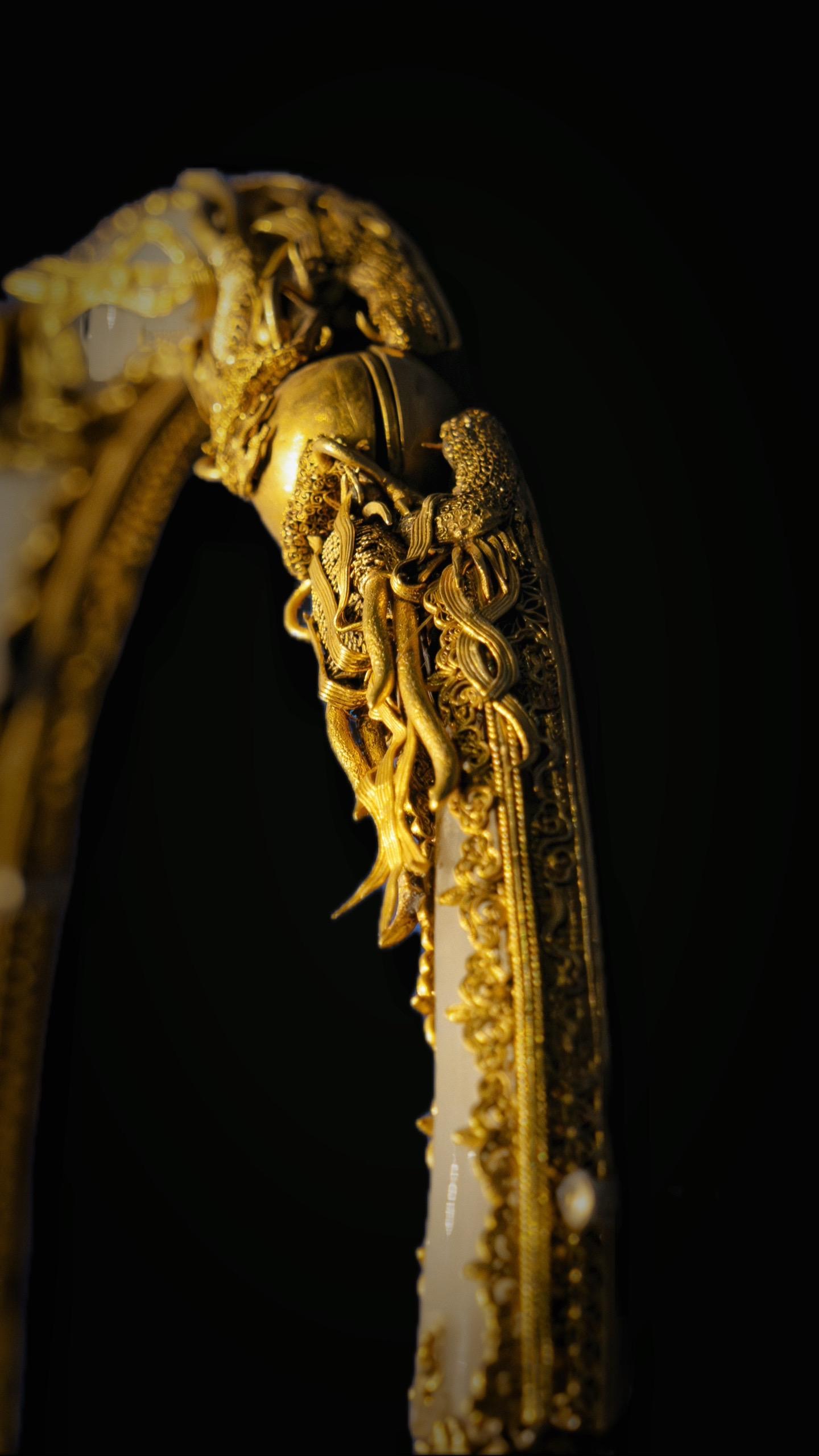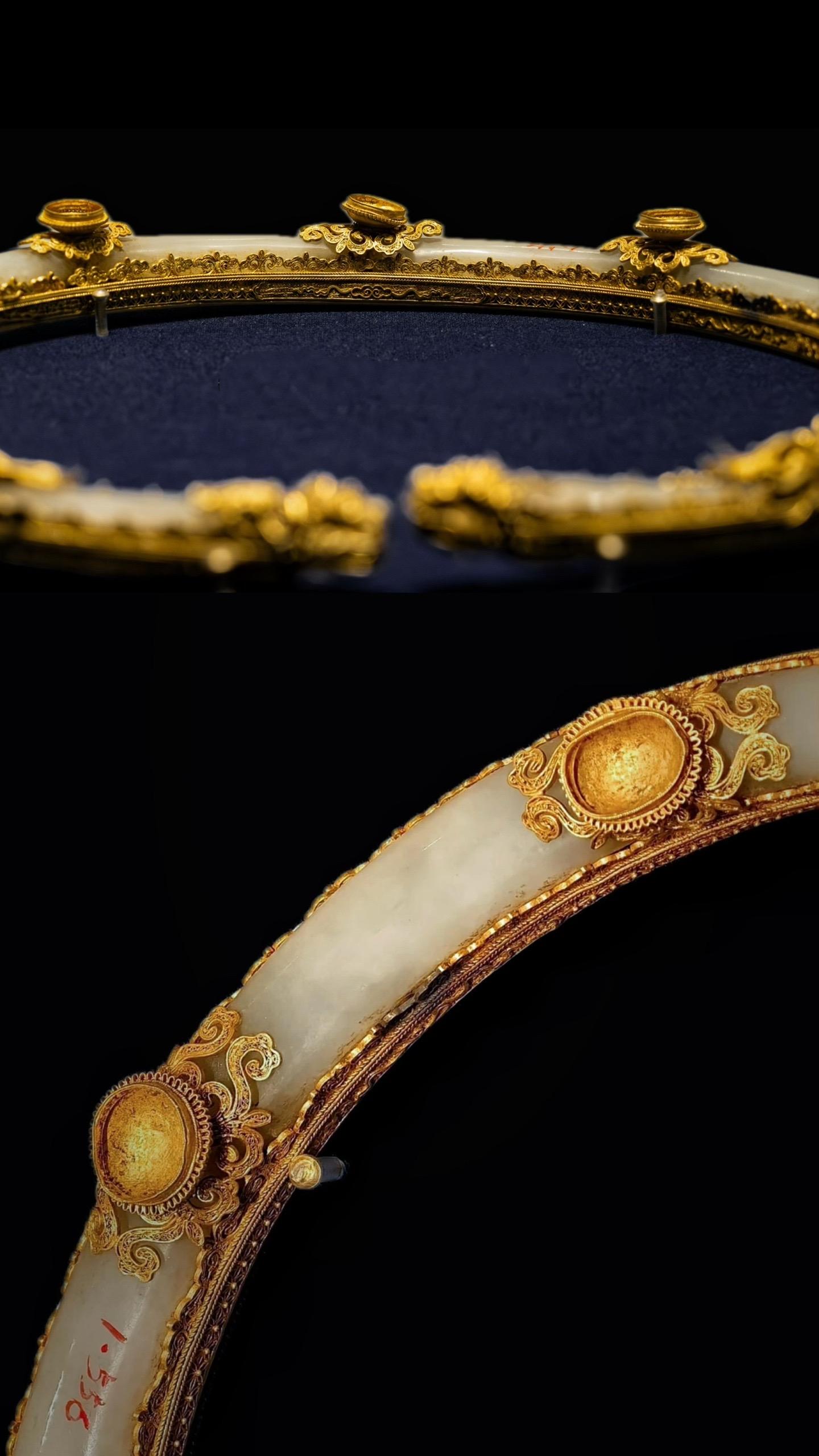 清代·累丝镶白玉双龙戏珠金项圈,项圈以玉为骨、以金裹玉,在金嵌宝处做出界隔,在两处龙首拱珠处借珠之造型形成可转动的机关,便于戴取;运用了范铸、錾花、累丝、焊接、镶嵌等多种工艺,繁缛而细腻,首都博物馆藏