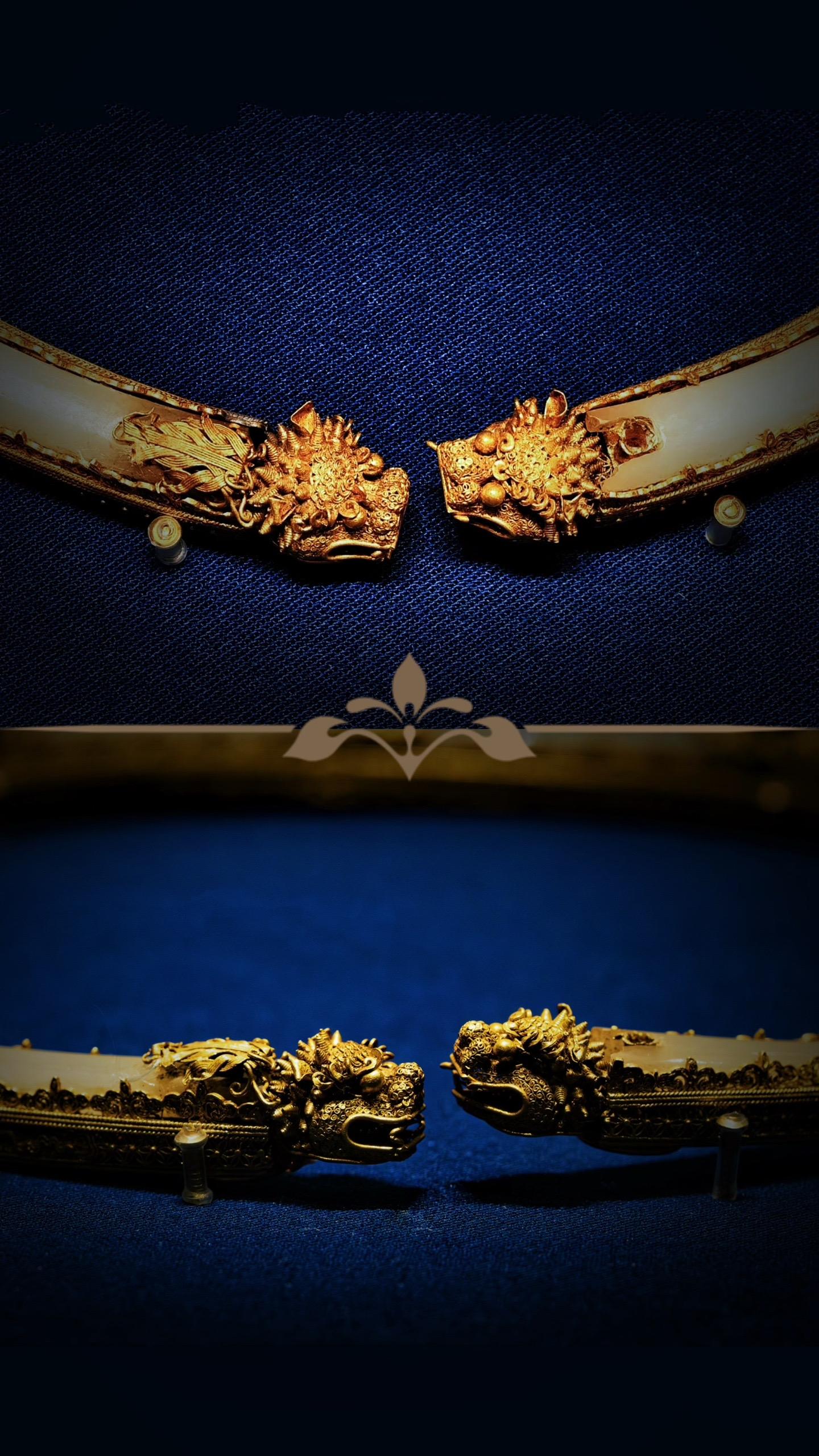 清代·累丝镶白玉双龙戏珠金项圈。今天和娃去看了《哪吒之魔童闹海》,看到哪吒脖子上明晃晃的乾坤圈,想起首博也有一件“金玉良缘”项圈