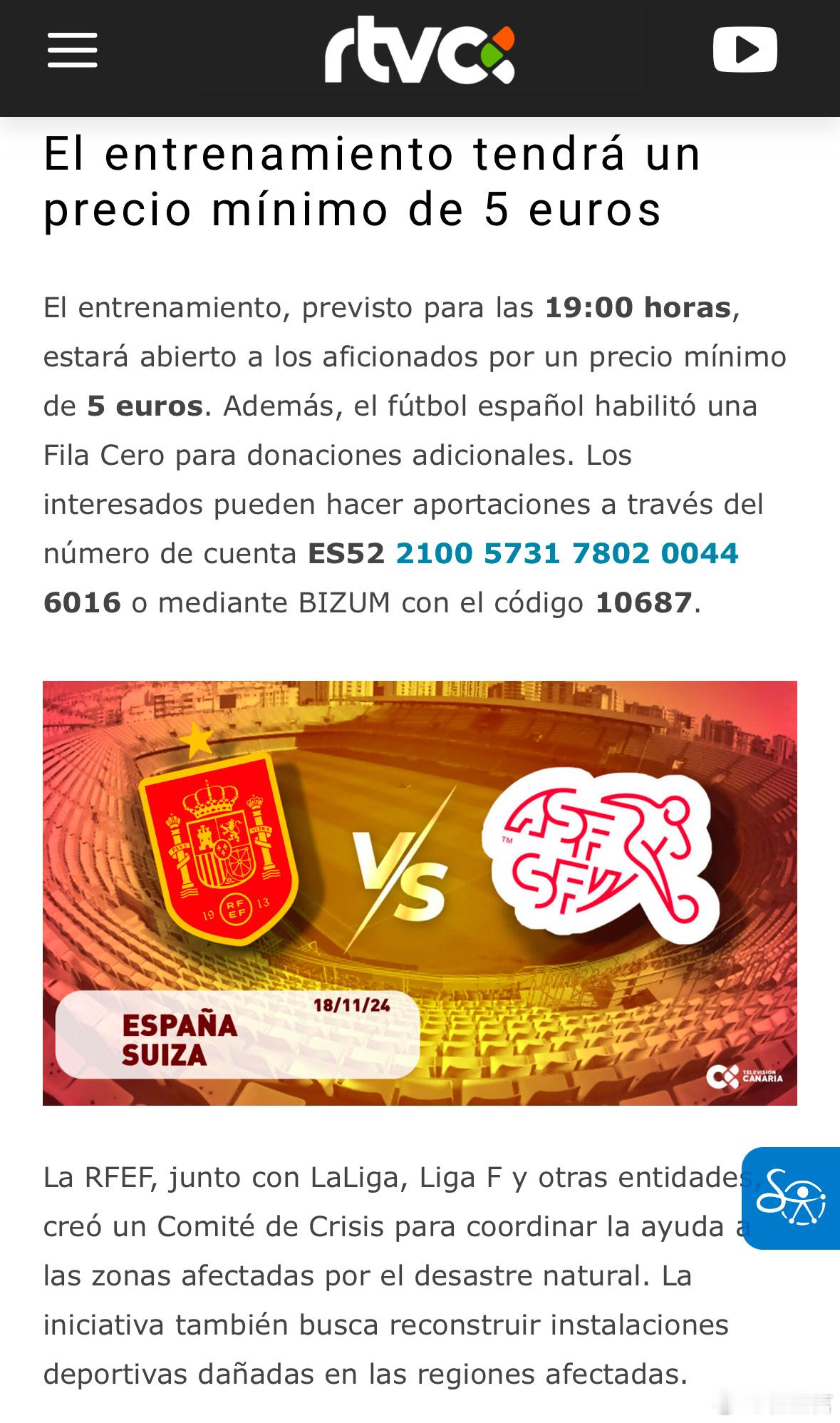 去年11月,欧洲冠军西班牙队的年度收官战,他们坐镇特内里费3-2击退瑞士。赛前的公开训练,门票价格5欧元起,且门票收入将捐赠给瓦伦西亚等地极端天气的受害者。