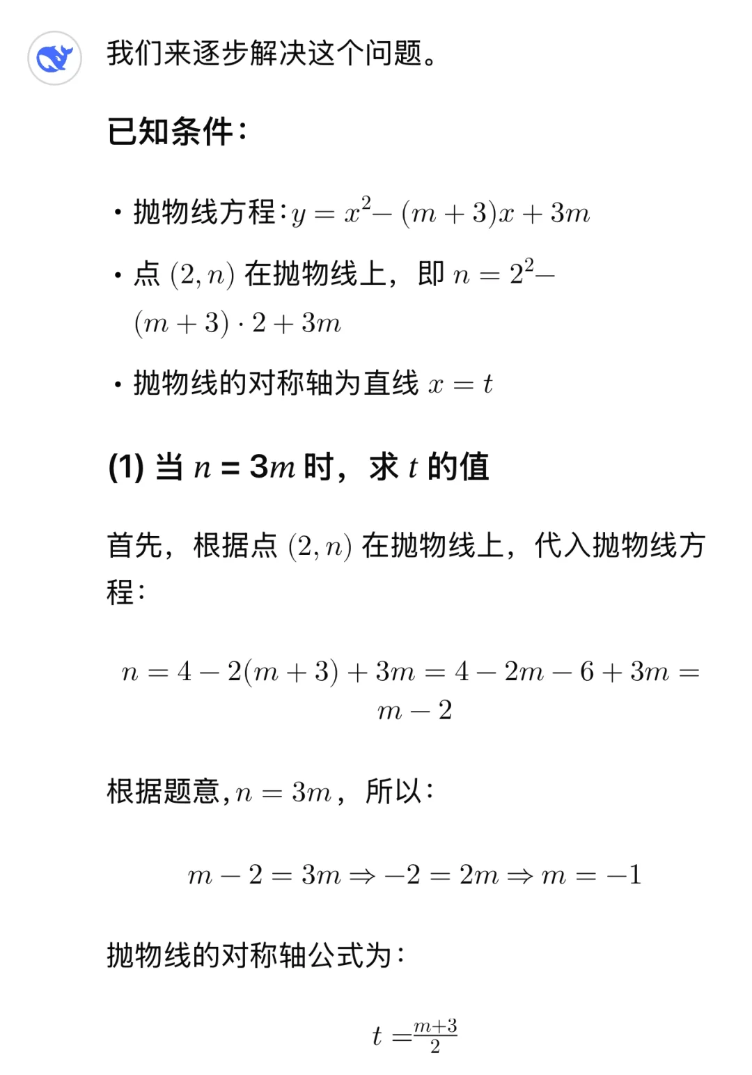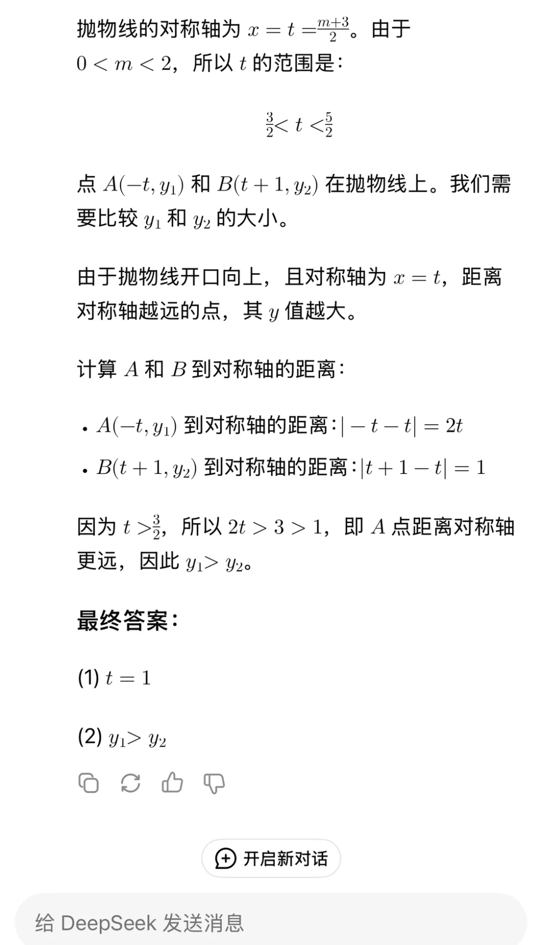 这是今年北京市东城区初三期末数学代数综合试题,AI 的解题过程近乎完美,思路清晰,步骤详尽完整,逻辑严密。照此发展速度,再过几年,普通学生或许真无需再请老师辅导了中考 北京中考 DeepSeek 目前几综的解题效果不理想,左下角练习册自己练吧