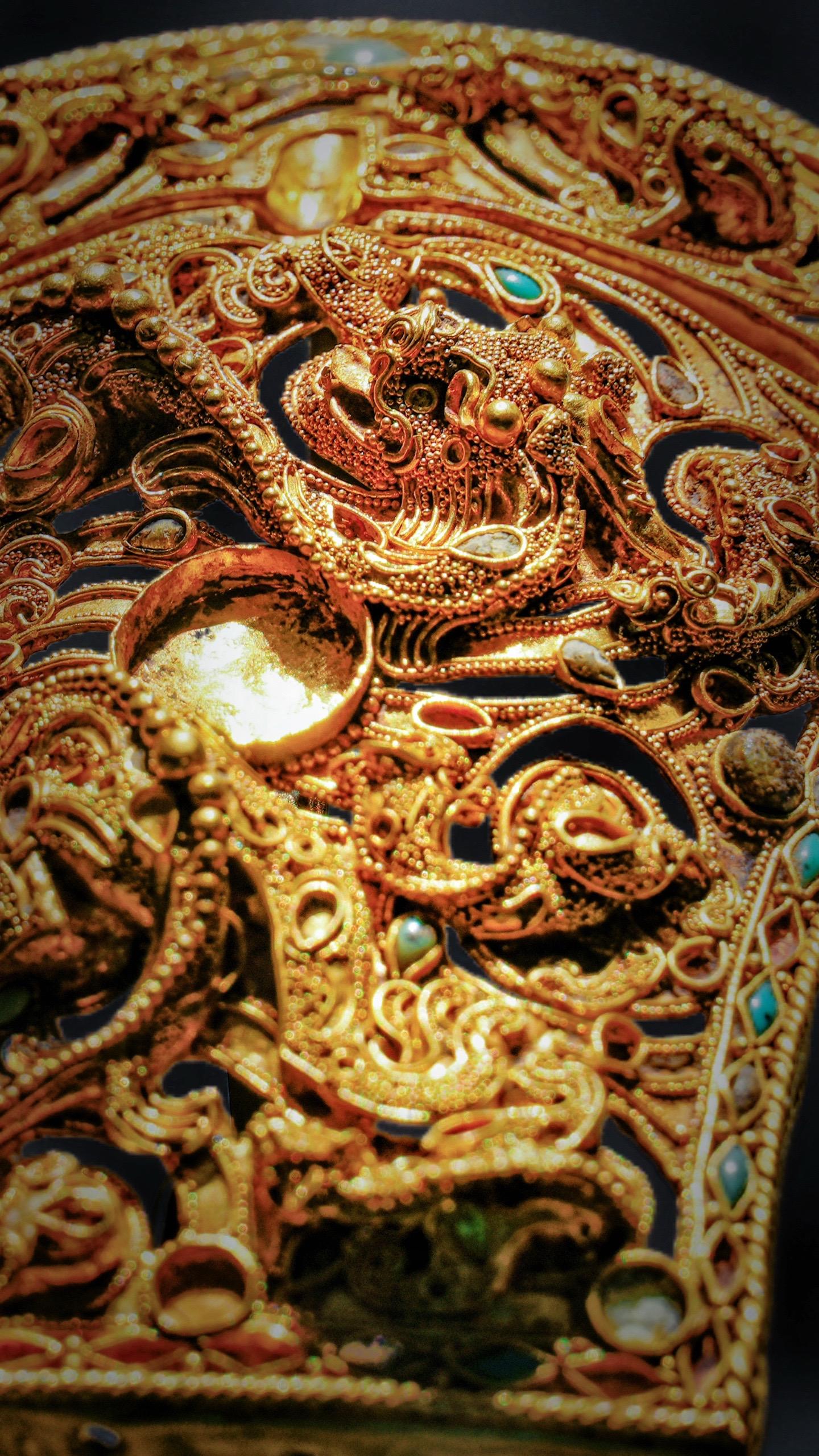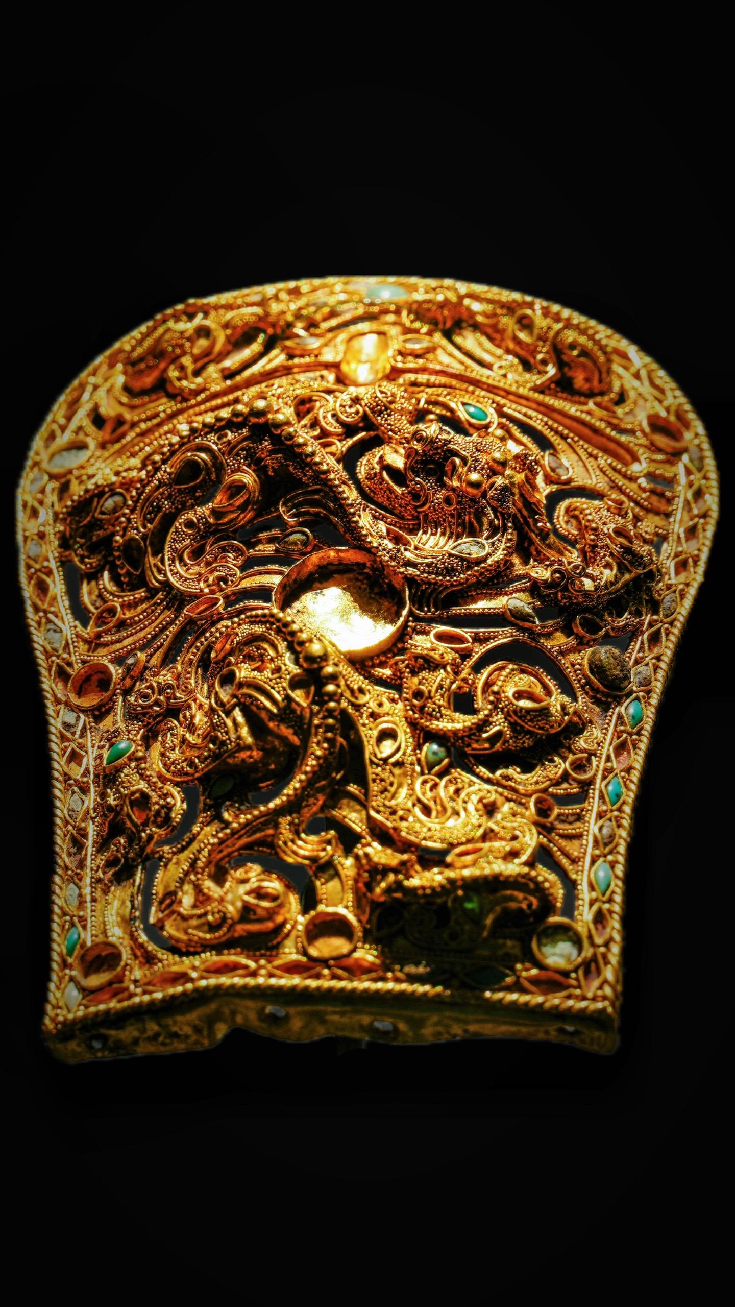 东汉·累丝镶宝八龙纹金带扣。白马饰金羁,连翩西北驰
