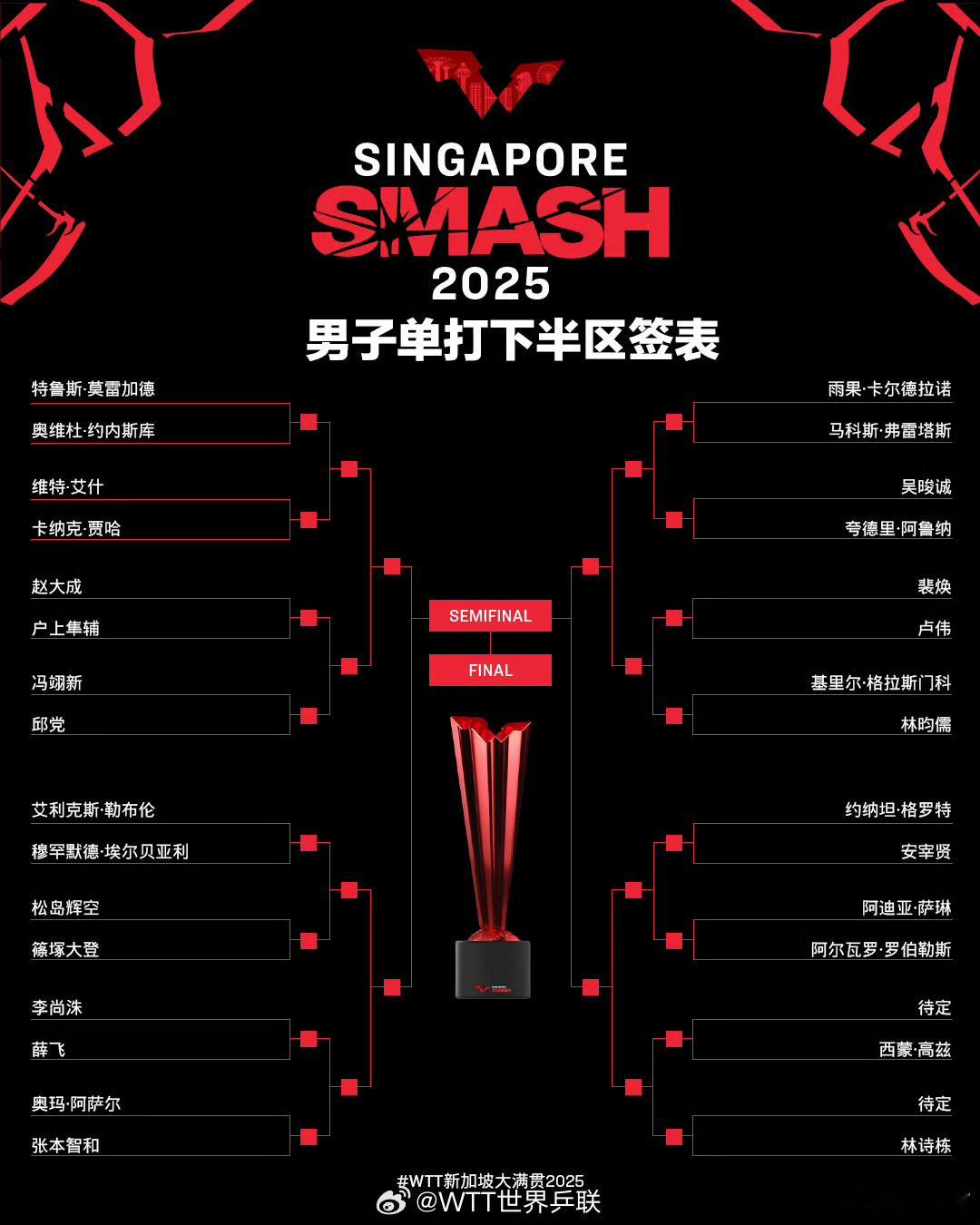 WTT新加坡大满贯男单签表。大家看好谁最终夺冠?