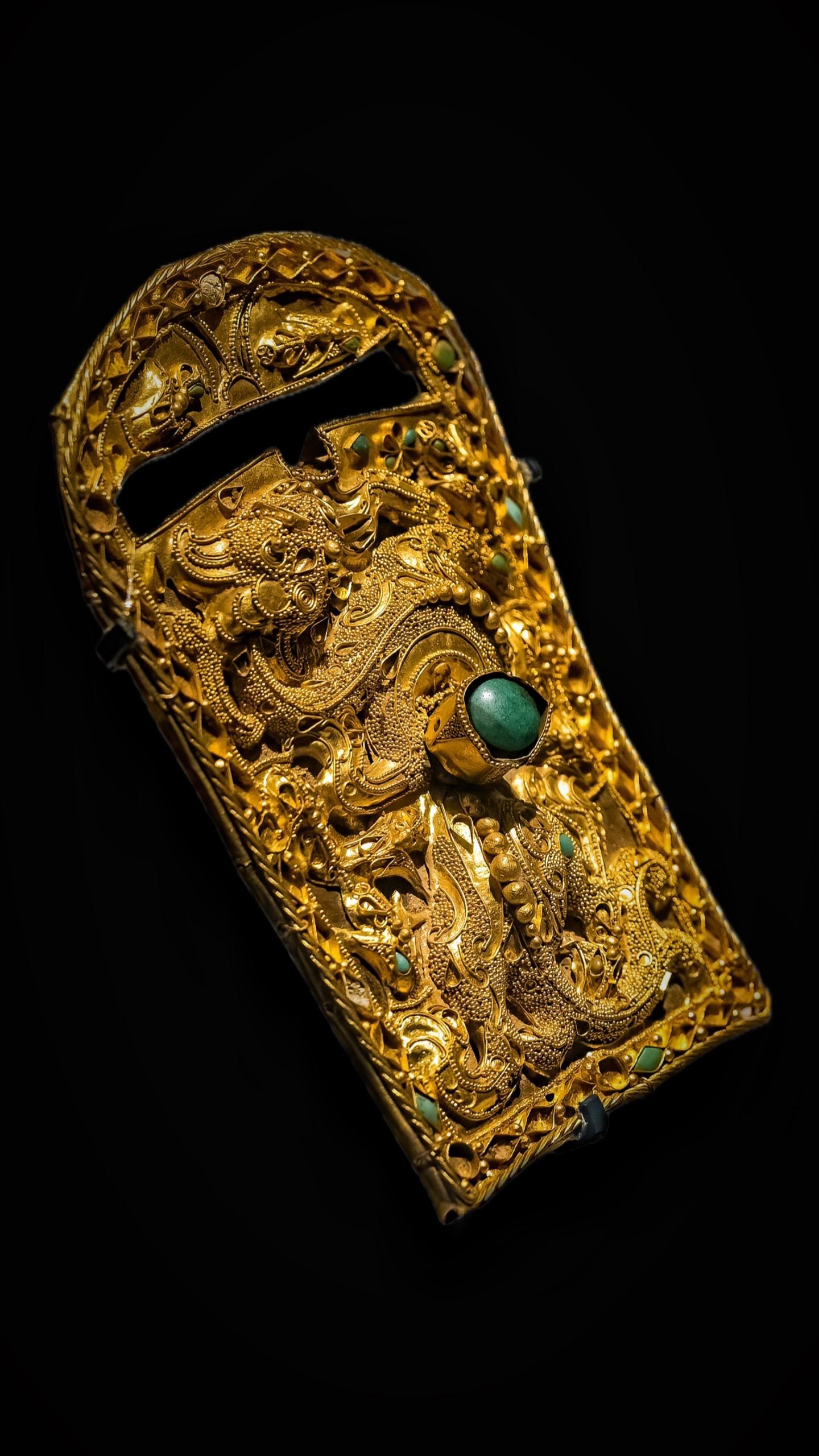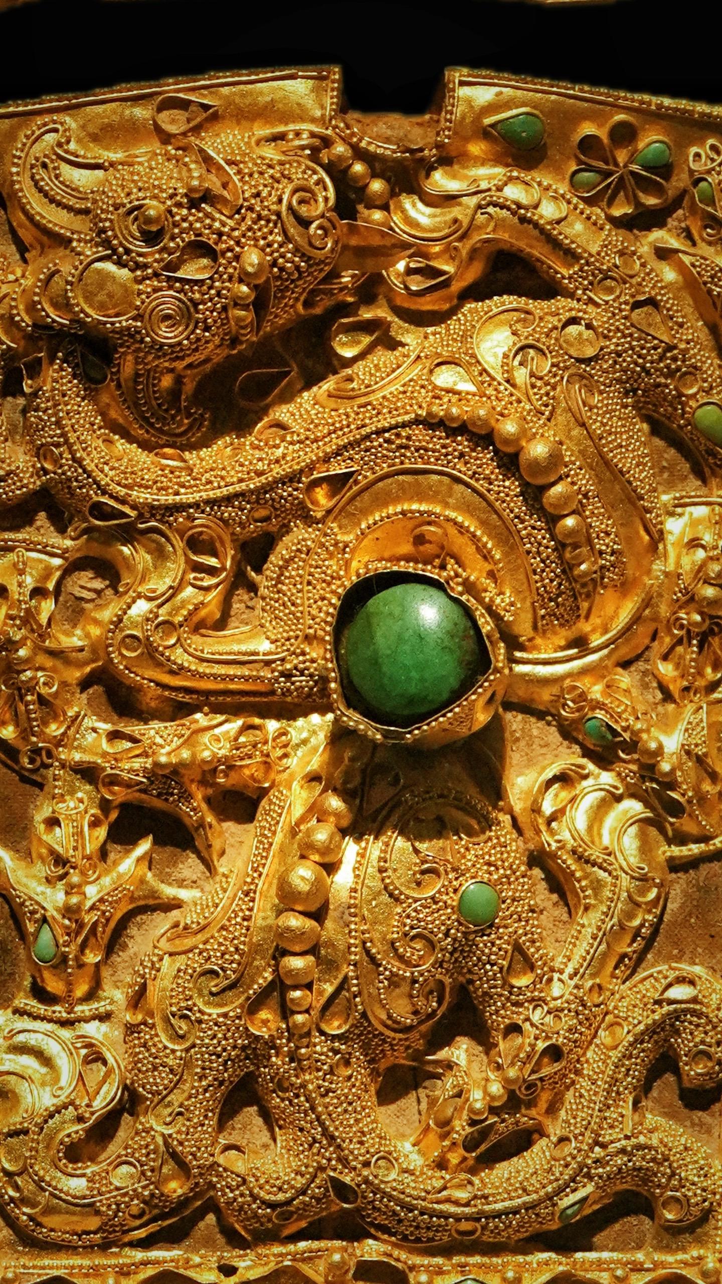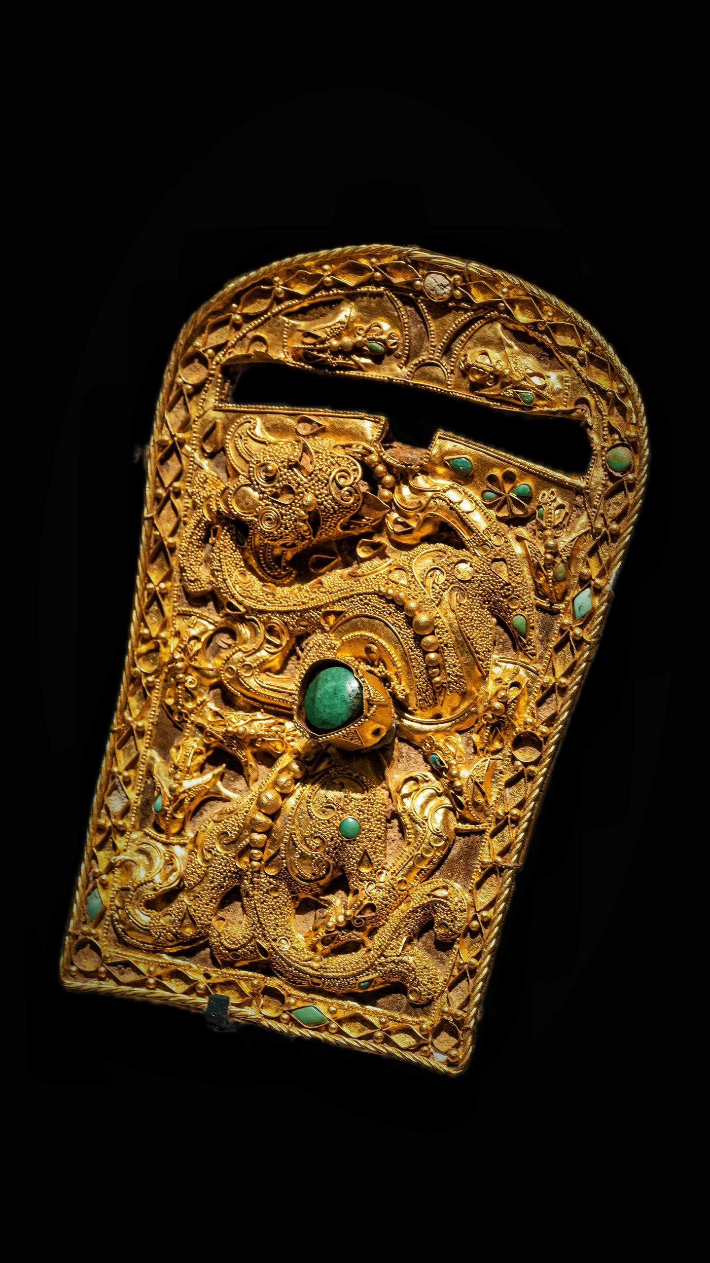 整器焊满金珠,镶嵌有来自异域的绿松石44颗(其中菱形36颗、圆形8颗,出土时大部分已脱落)