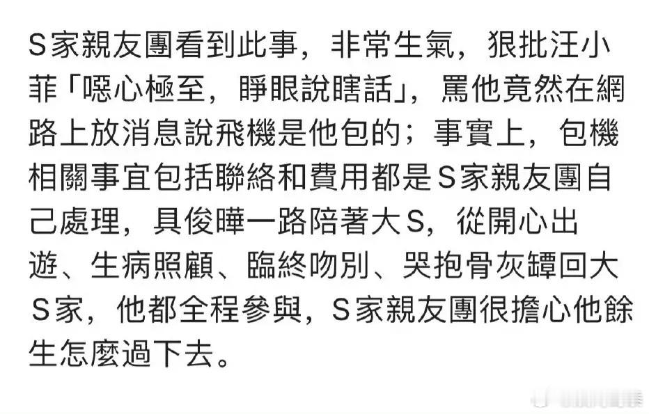 小S说姐姐后事都是由徐家人负责的,而具俊晔一直陪着大S,开心出游,生病照顾,临终吻别,抱着大S骨灰坛回家,一直都在。徐家人很担心他余生怎么过。