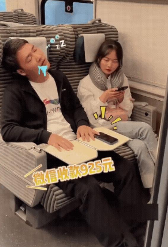 高铁上男子困的睡着了,而他的提示音不断的响着,微信收款 925 元、微信发款 150 元、微信收款 76 元、微信收款 4600 元……