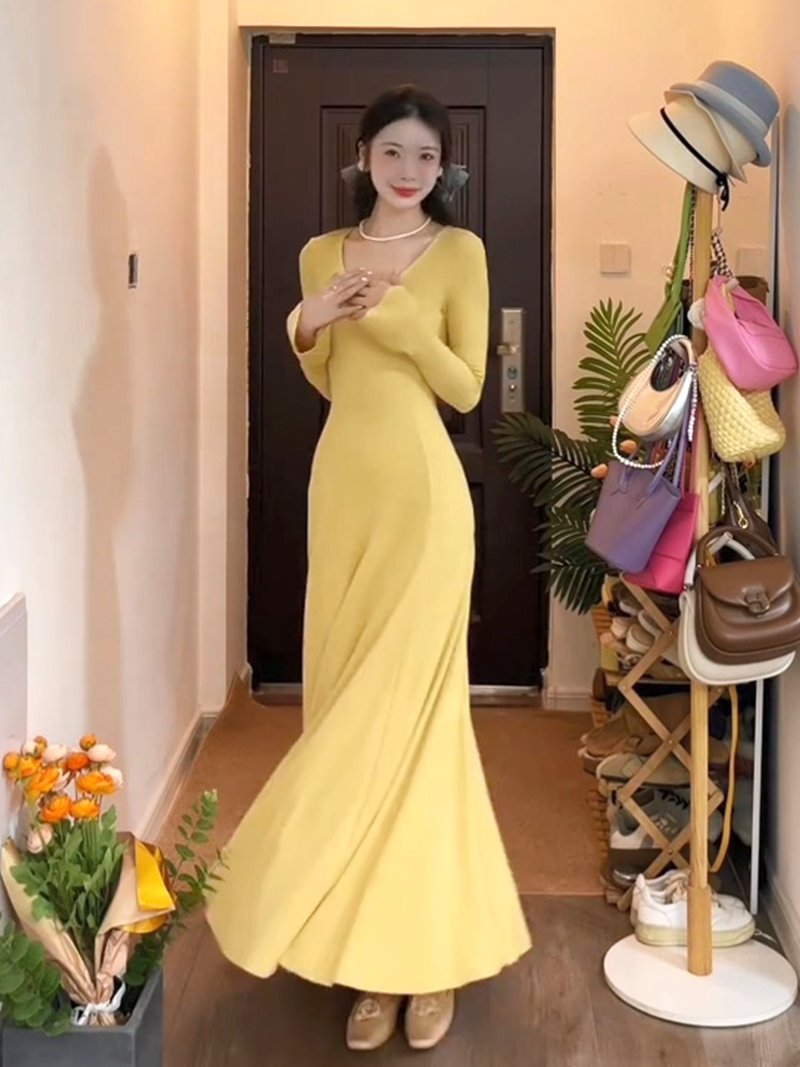 黄色V领连衣裙高级感掐腰裙多巴胺绝美小裙