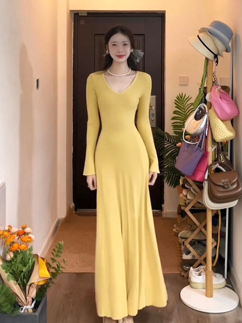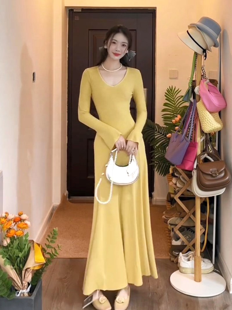 OOTD黄色V领连衣裙高级感掐腰裙多巴胺绝美小裙 赋予一件衣服的人格,不需要太多装饰,极简视觉,意外塑造出个性姿态。