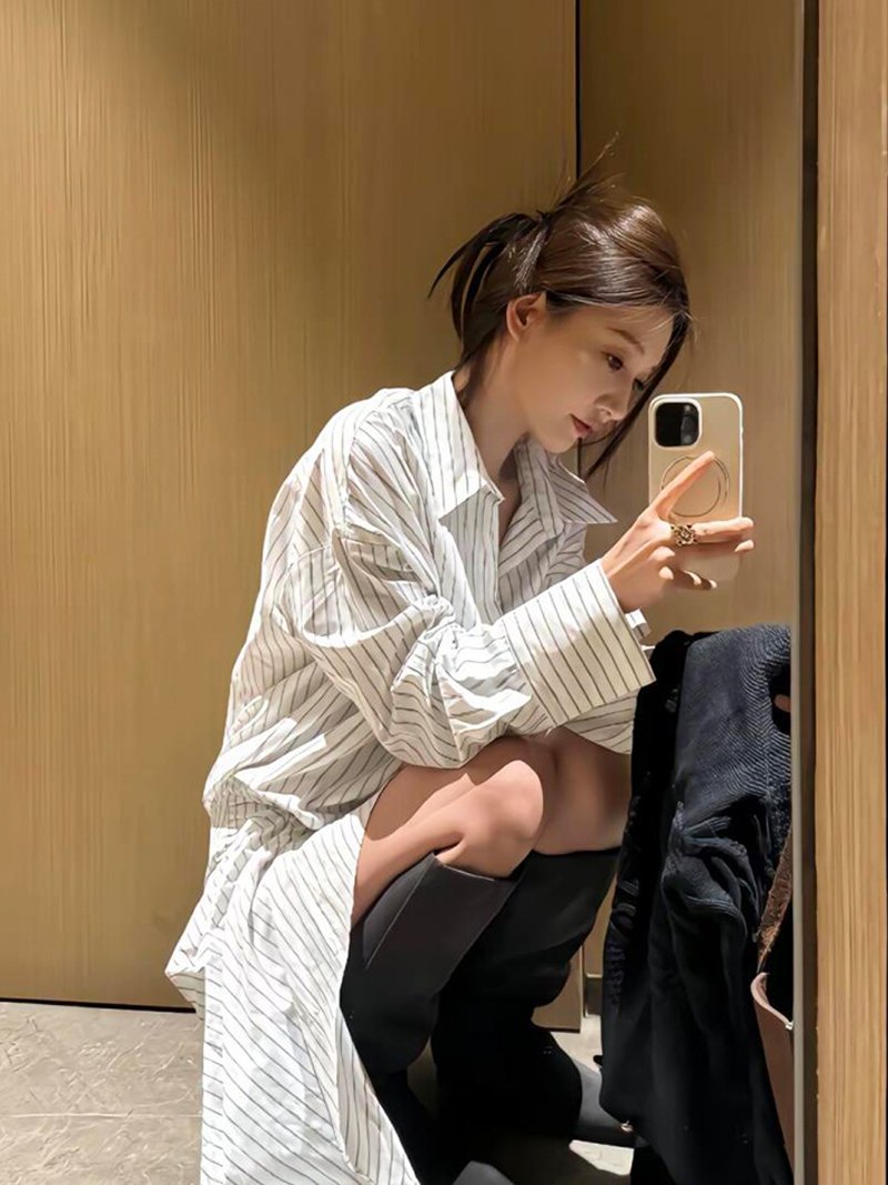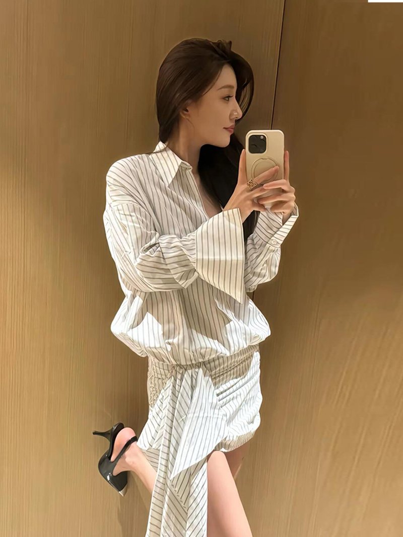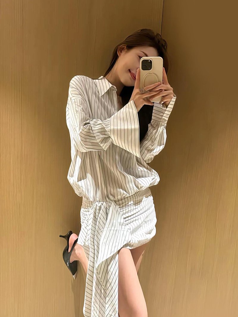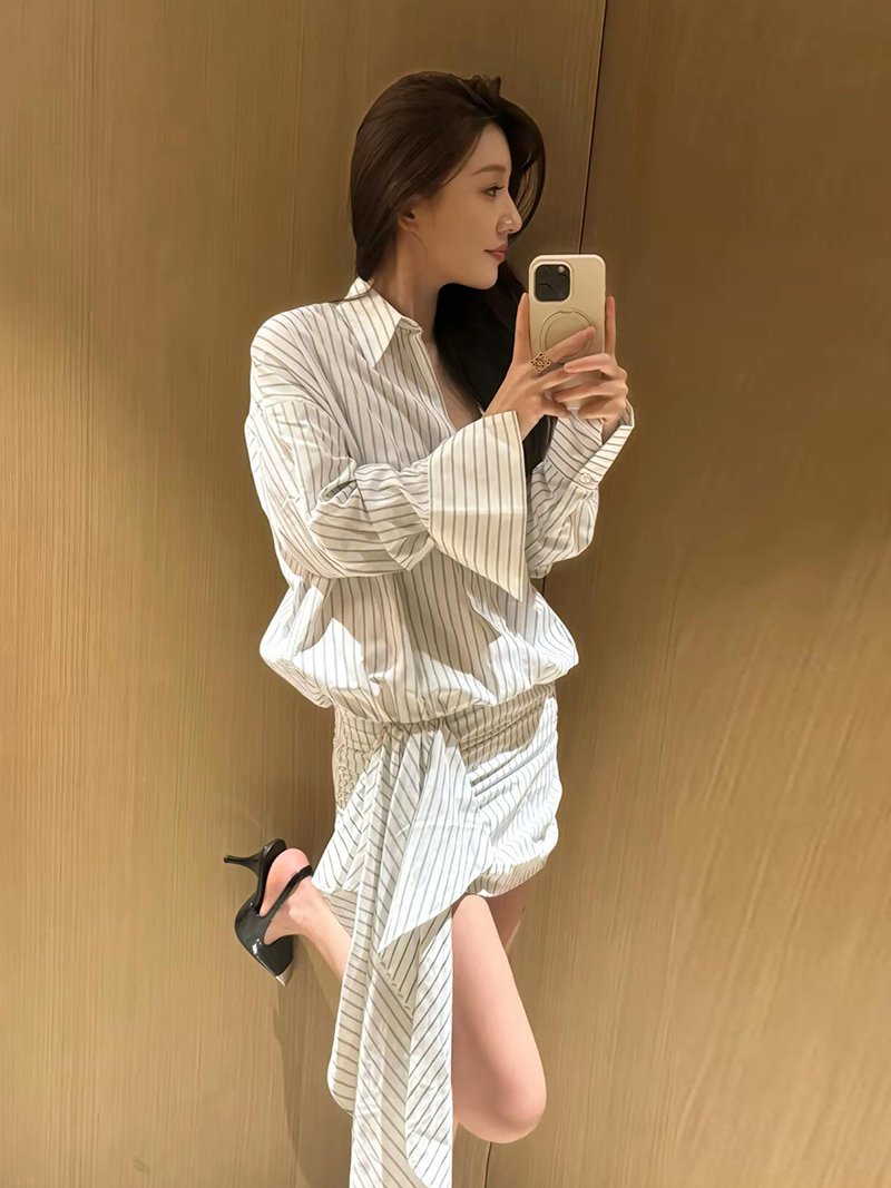 OOTD高级感白色不规则条纹连衣裙法式气质衬衫裙 任何文字,都不及你看到镜中的自己时,内心藏不住的小窃喜。