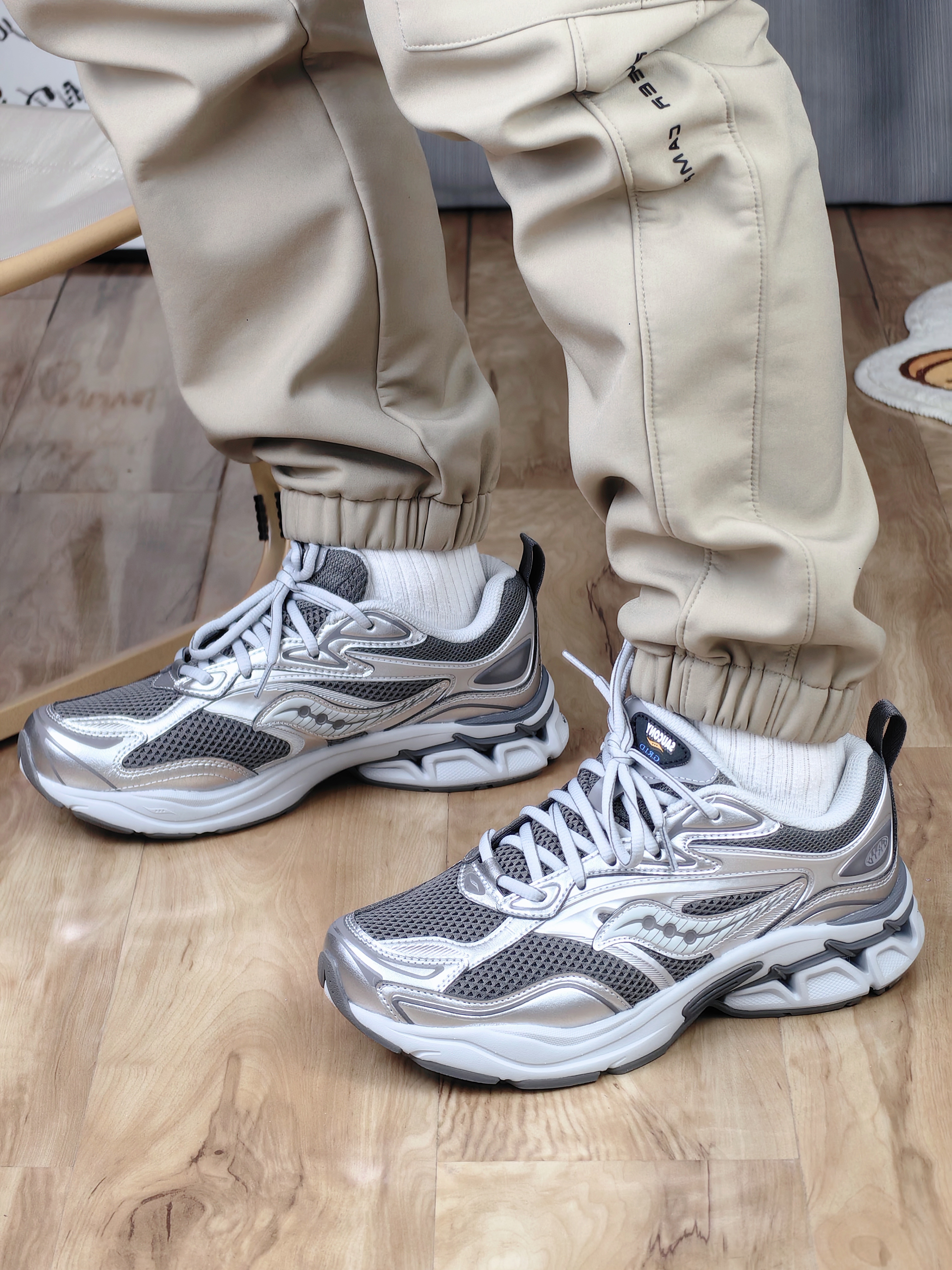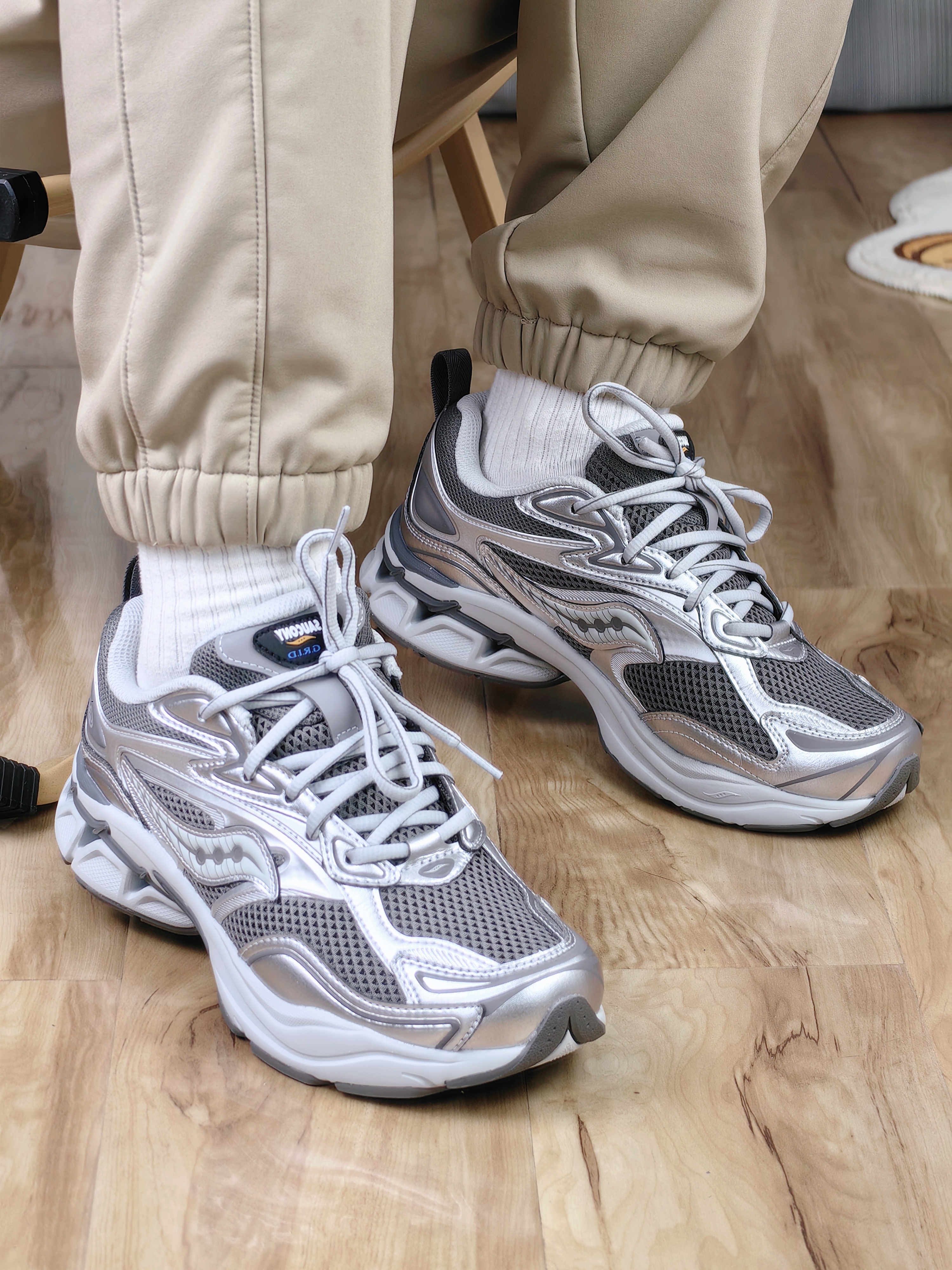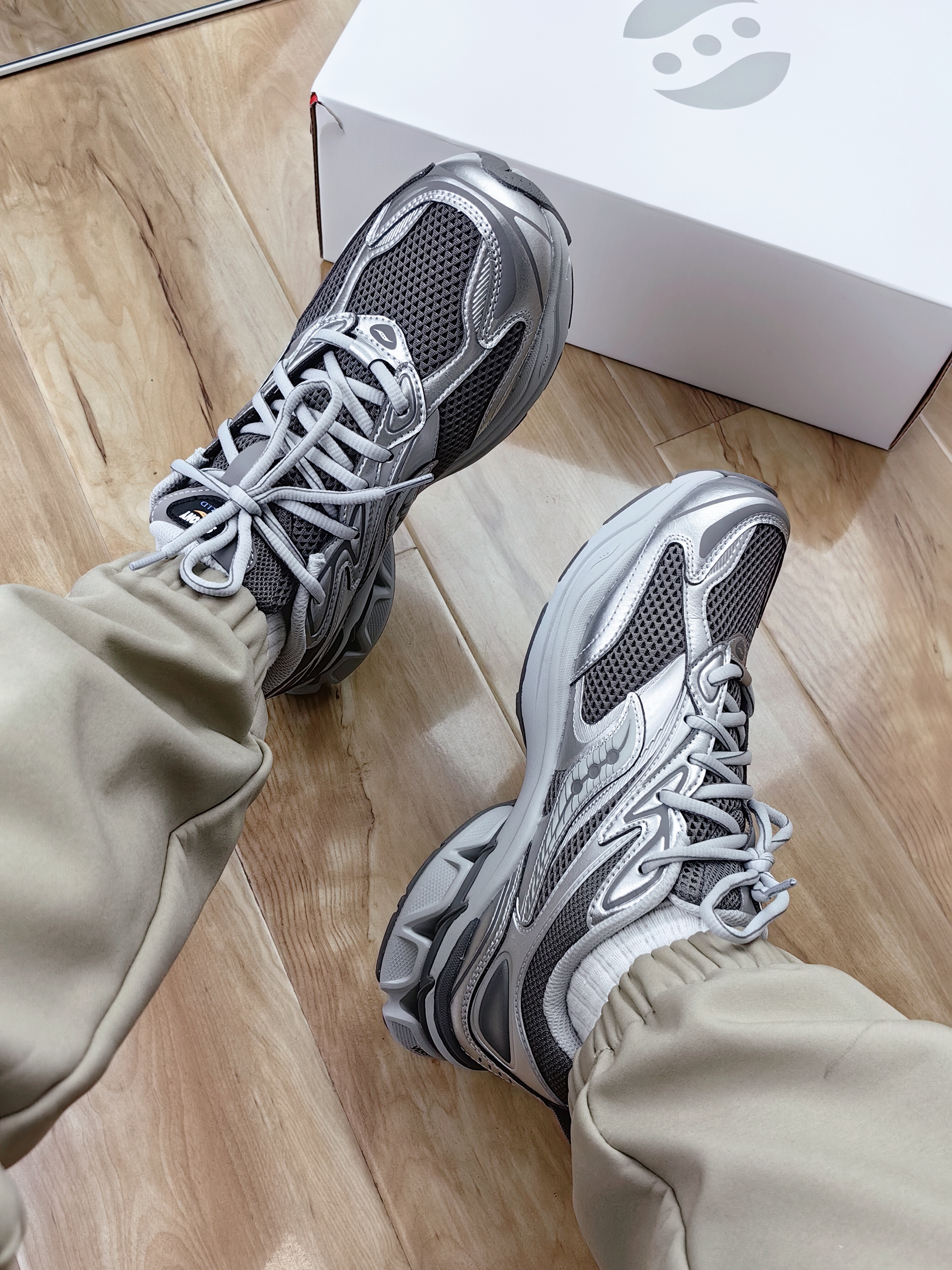 这双索康尼的复古老爹鞋比一般的老爹鞋要更有质感一些。有几种配色啊,我选择是一个这种颜色的千禧配的,blingbling的这种感觉搭配的话一定要搭配这种亮色系的会更好看,不要搭配这种深色系的。