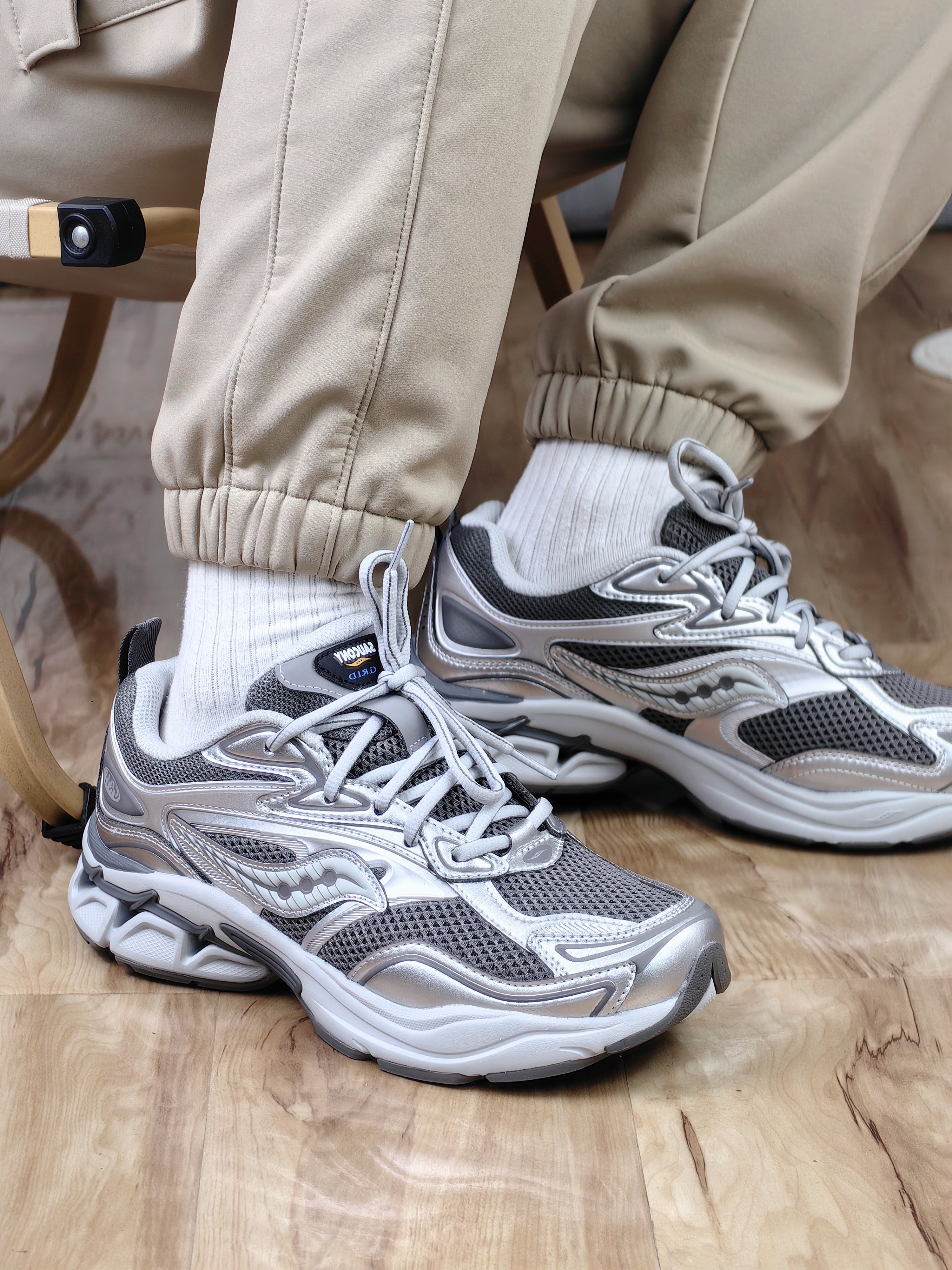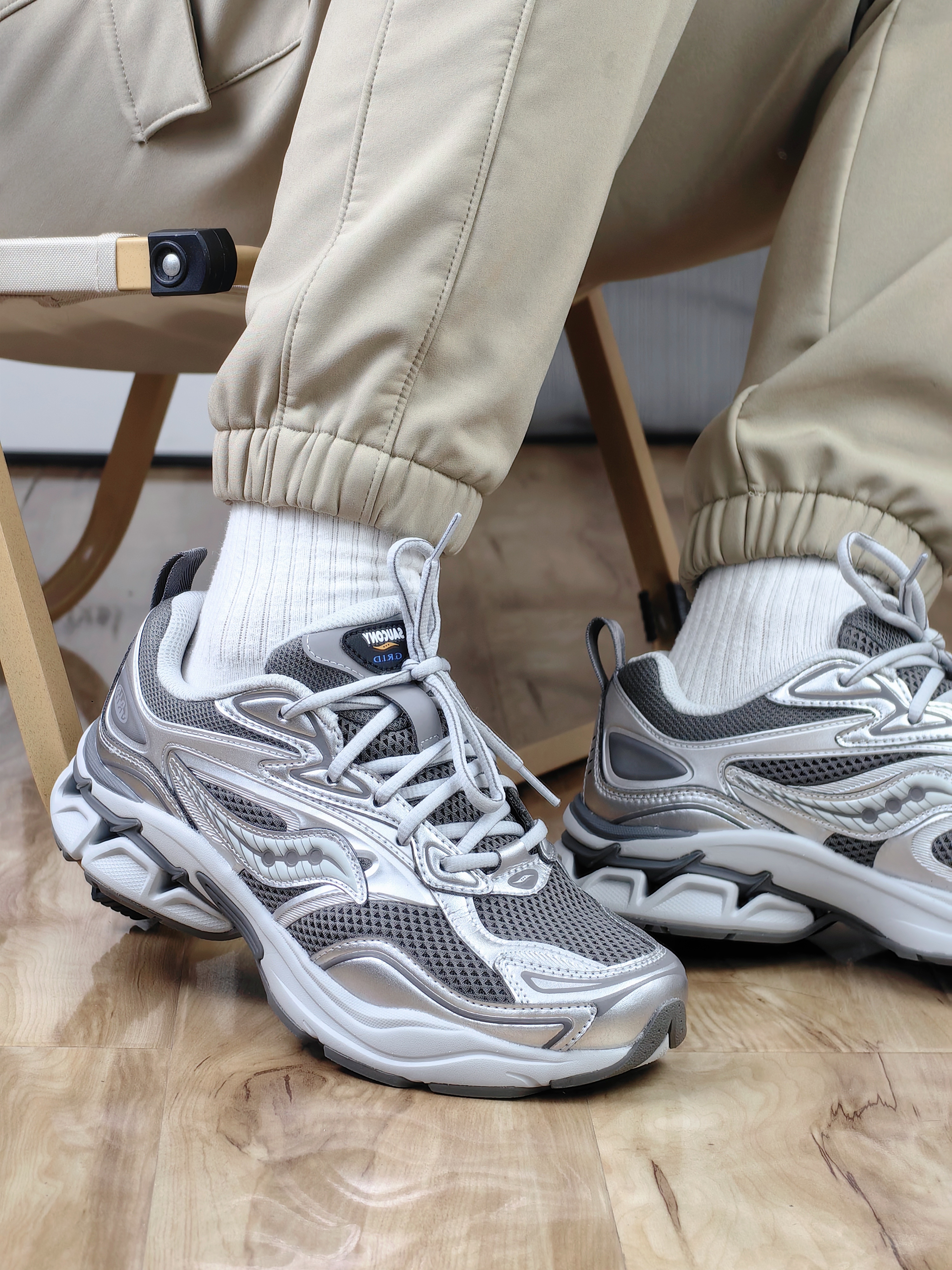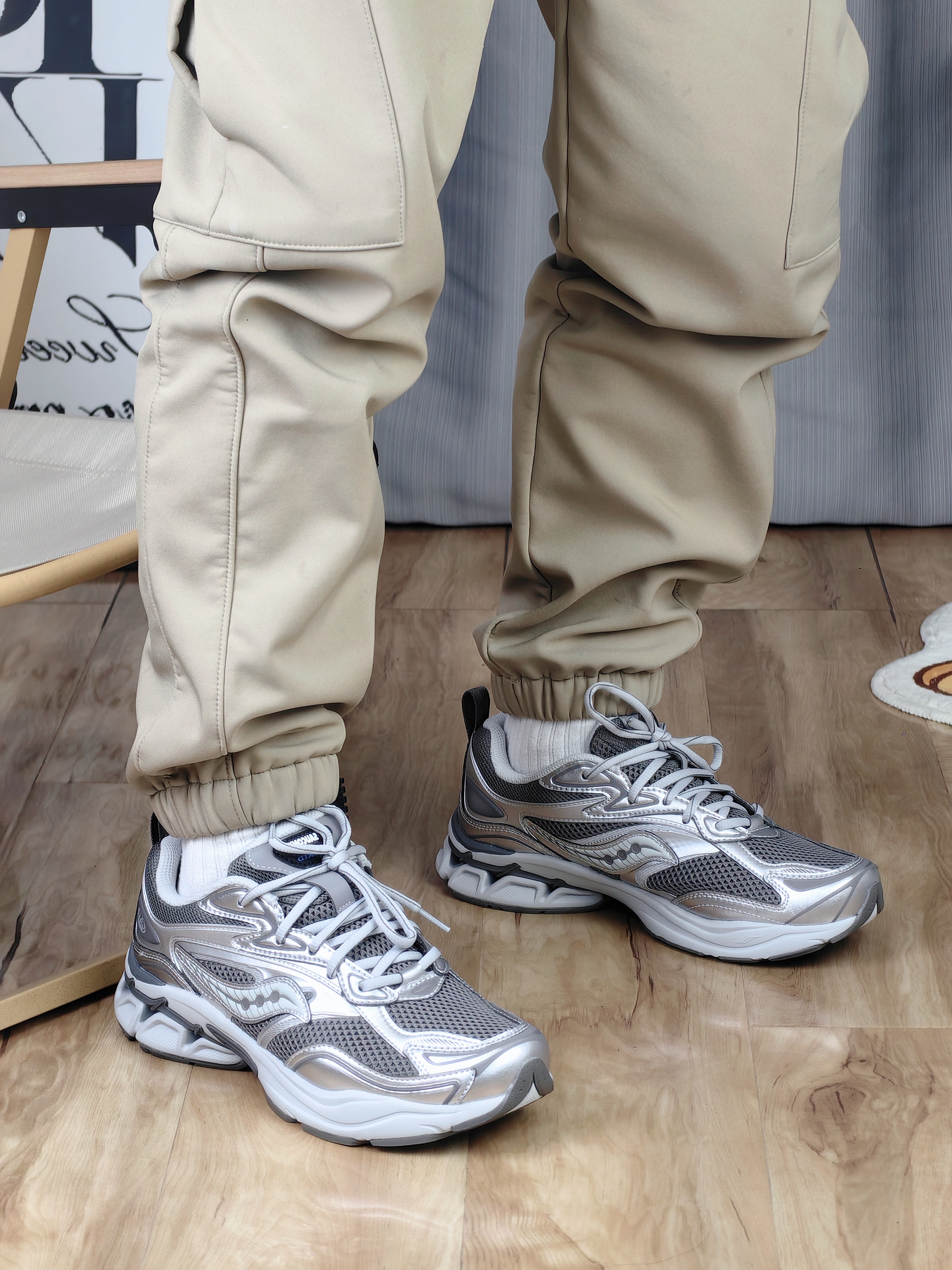 这双索康尼的复古老爹鞋比一般的老爹鞋要更有质感一些。有几种配色啊,我选择是一个这种颜色的千禧配的,blingbling的这种感觉搭配的话一定要搭配这种亮色系的会更好看,不要搭配这种深色系的。