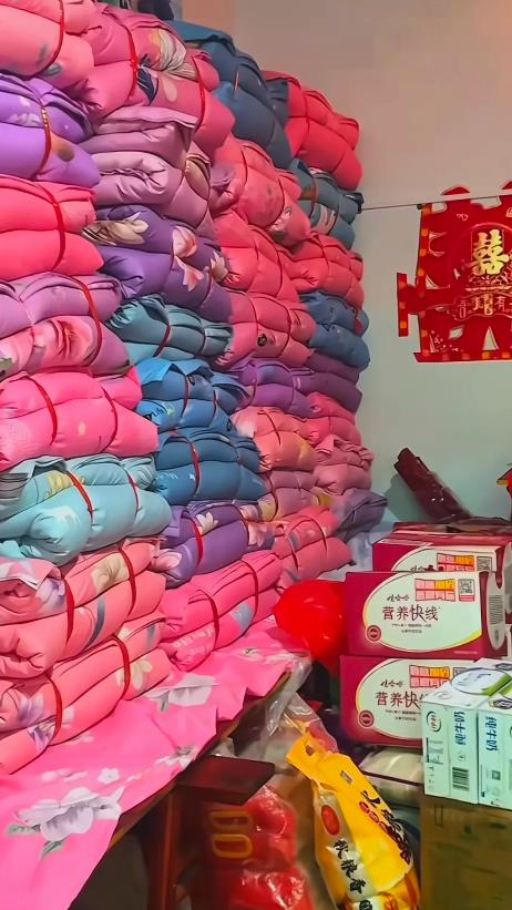 此事,引起大家热议,有网友表示:这么多被子,相信结婚一次,以后儿孙三代都有得用了。