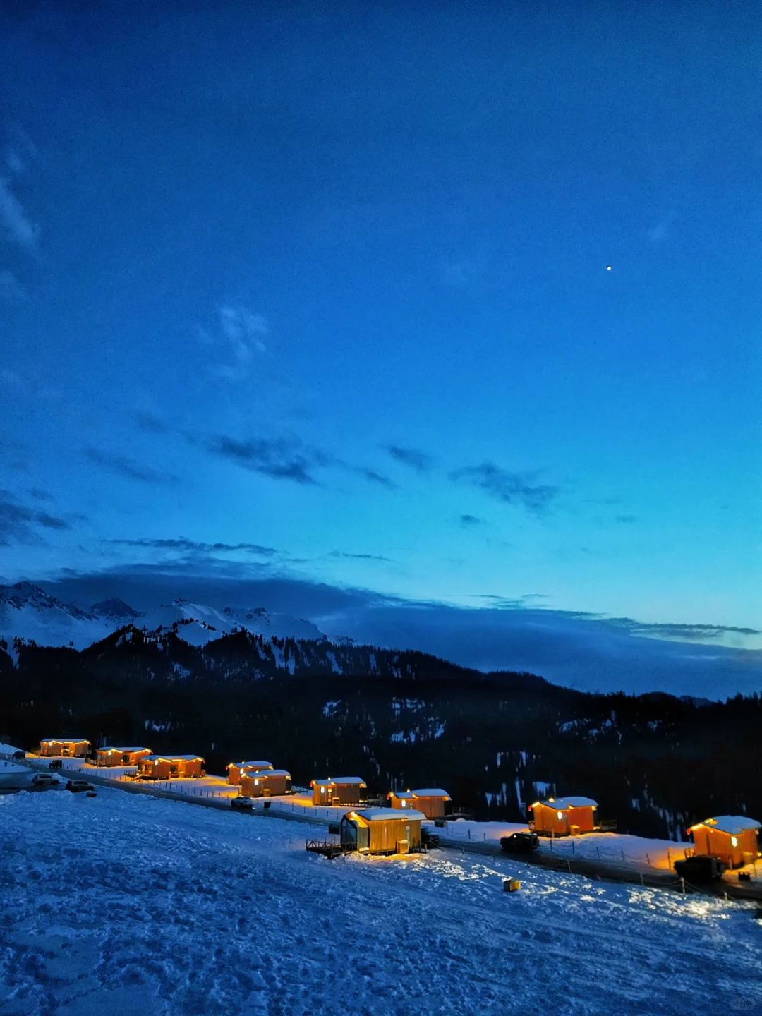 不是北欧,是新疆伊犁库尔德宁! 在这个小镇待了几天,住在山上的营地,相比白天的热闹,我更喜欢人流褪去后这份蓝色浪漫! 反向出行真的太香了!独享雪山浪漫