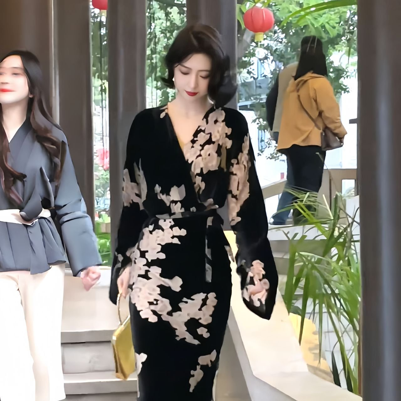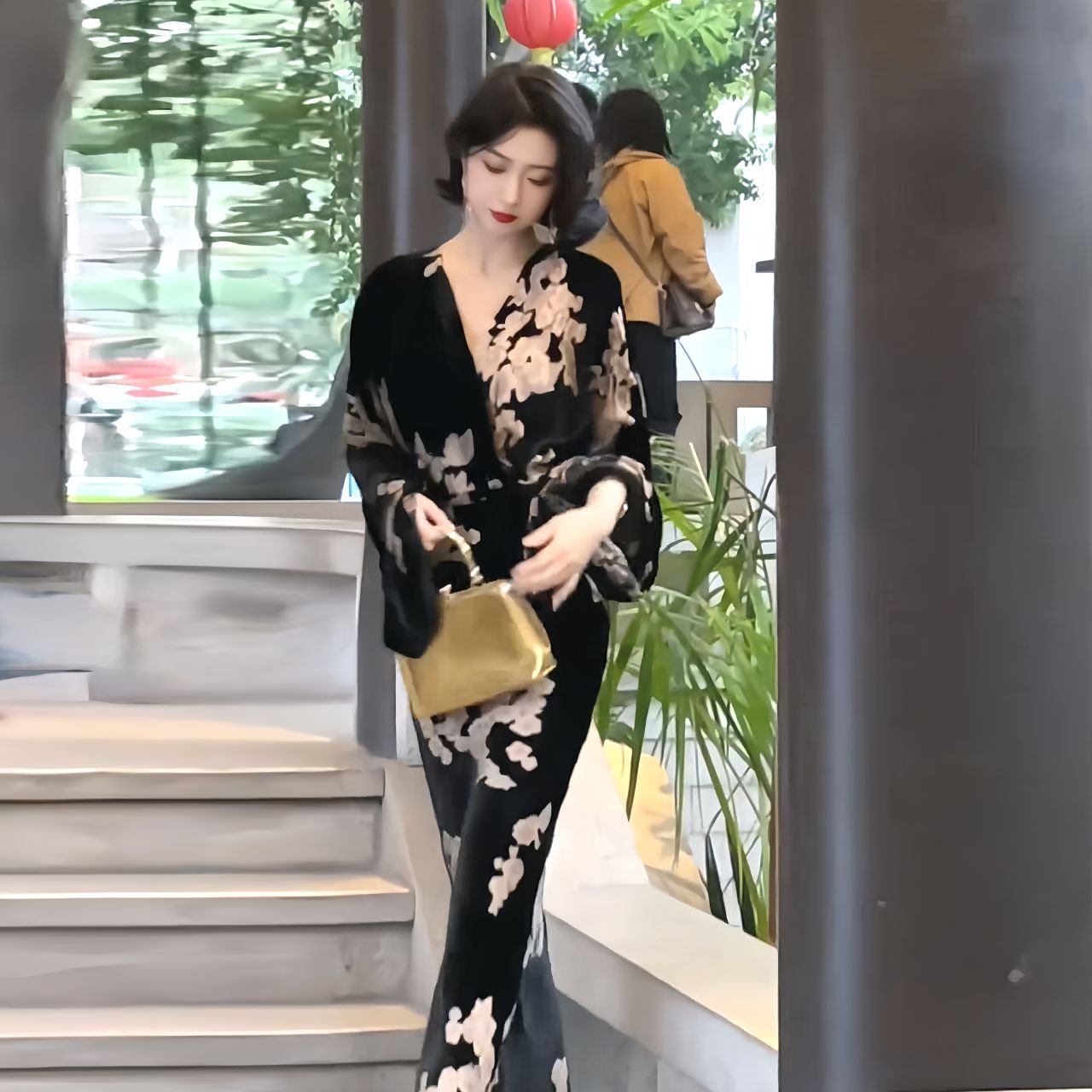 灯笼袖印花连衣裙精致小姨穿搭海边度假裙子